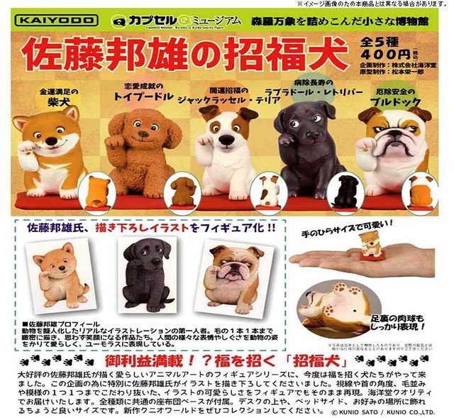 海洋堂知名的轉蛋品牌《膠囊Q博物館》(カプセルQミュージアム),在之前2016年底以日本知名插畫家佐藤邦雄所繪製的擬人化貓咪作品「招福貓」為題材推出後,相當受到愛貓玩具人們的喜愛,之後繼續推出「第二彈」的招福貓咪也是相當熱賣,此次將繼續推出「佐藤邦雄的招福犬(佐藤邦雄の招福猫)」!
