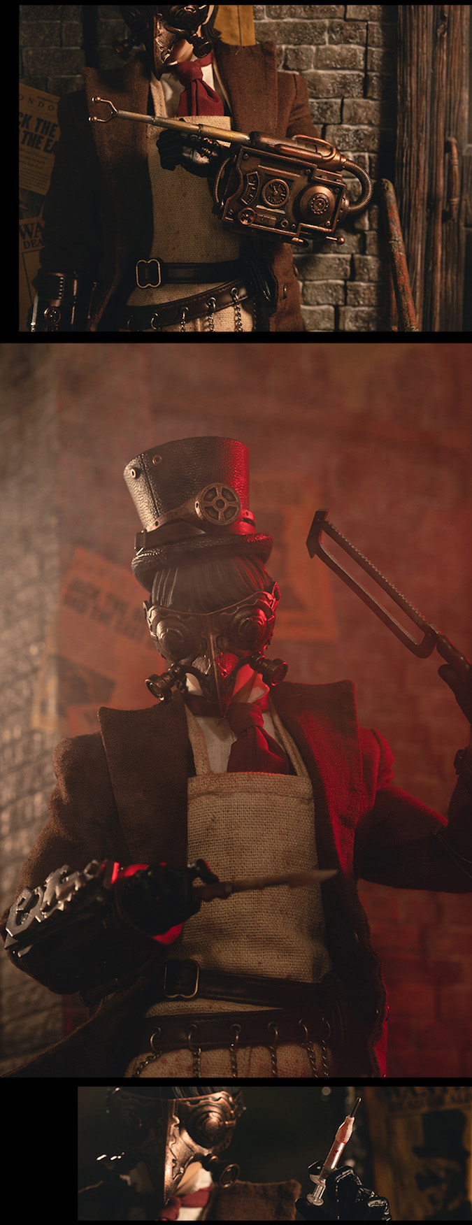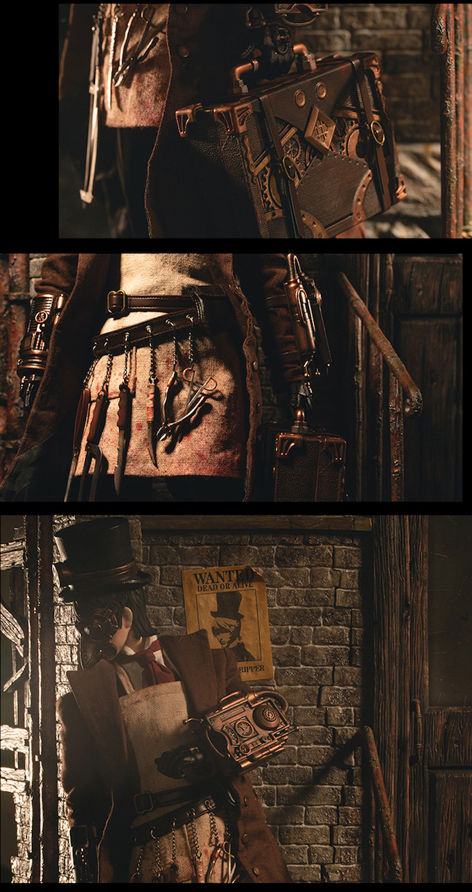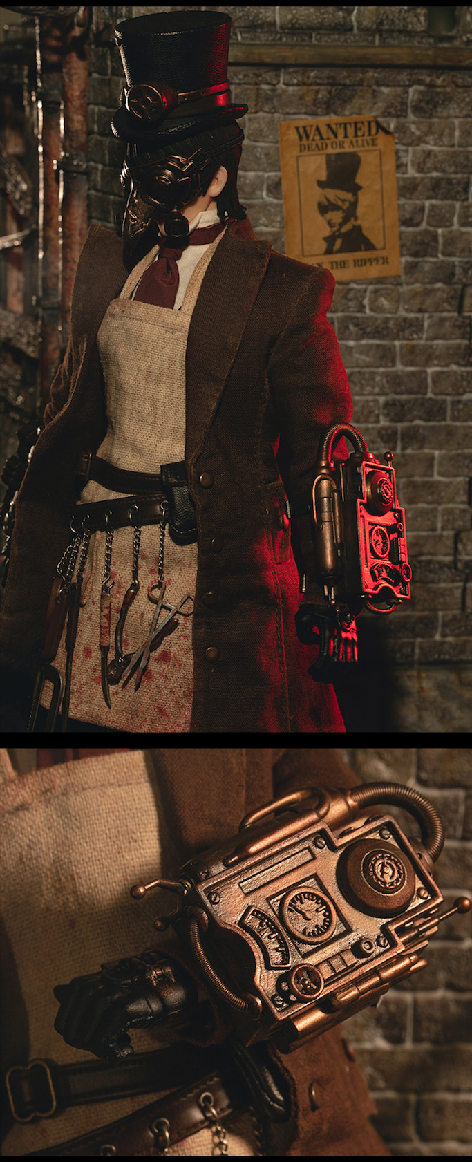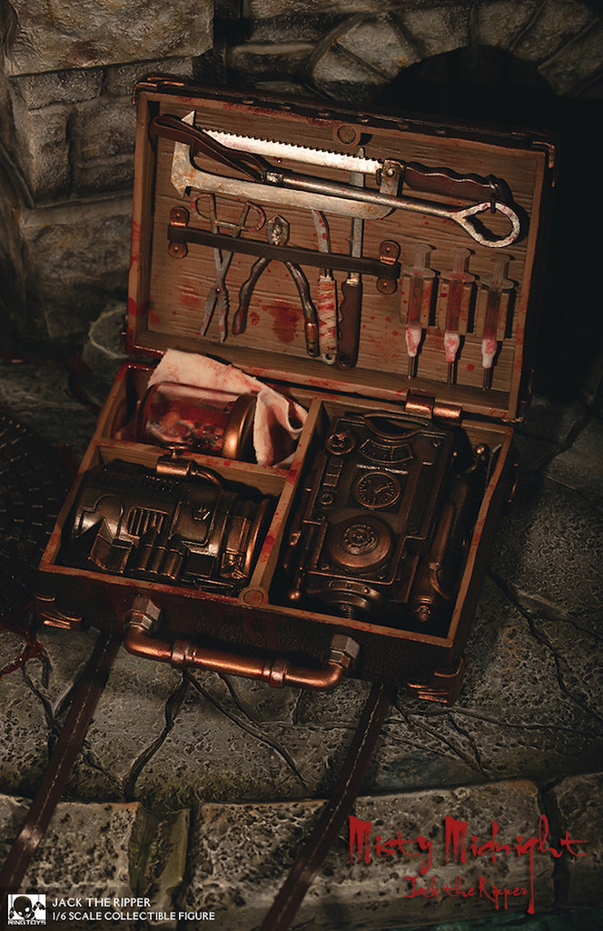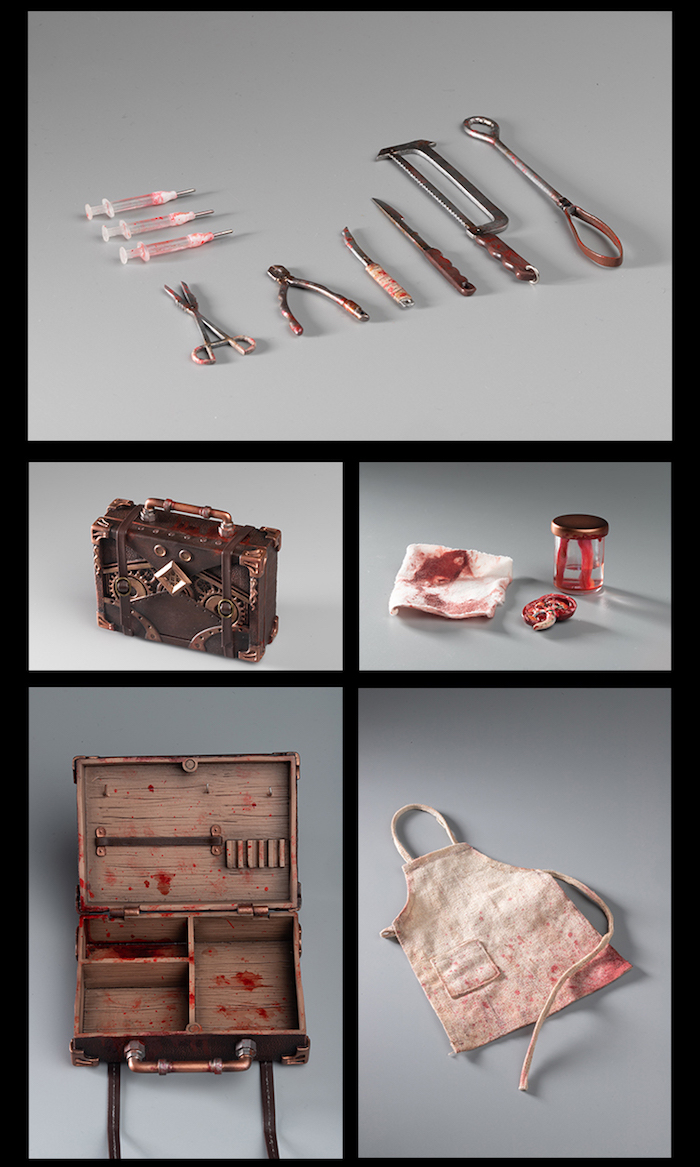 配件陣容超豐富的~細緻的收納箱、左手的伸縮電叉、右手的折疊刀都帶有蒸氣龐克的風格,各式犯案的工具更一應俱全!匕首、手術刀、鉗子、針筒注射器、透明儲物瓶、剪刀、鋸子......等,實在好獵奇呀~而且許多工具還可以掛在腰帶上,使這款人偶更添恐怖氣息!除了令人毛骨悚然的工具外,還附屬多個替換手、報紙、羽毛筆、「來自地獄」的信件與半顆腎臟!