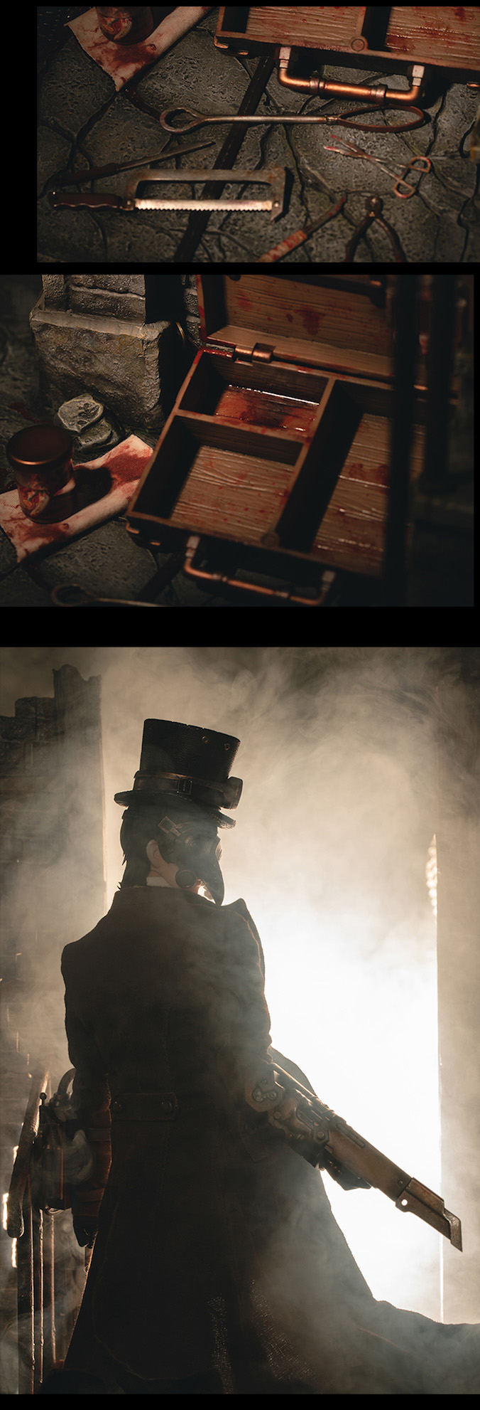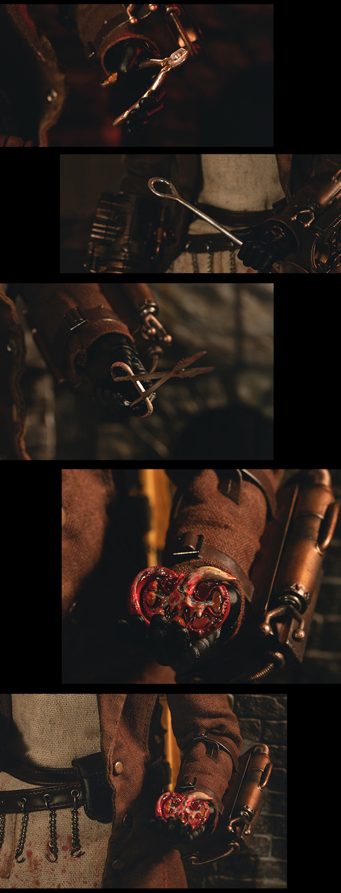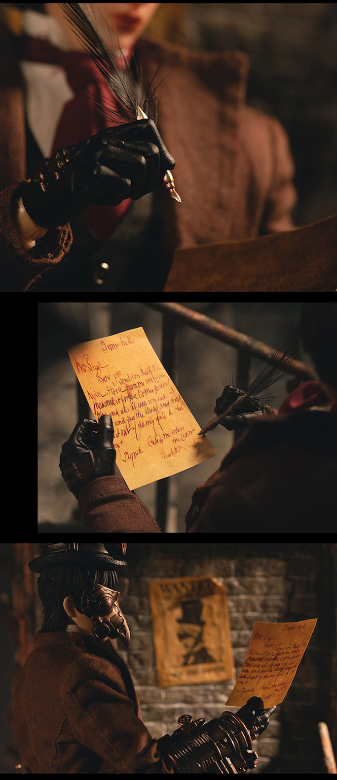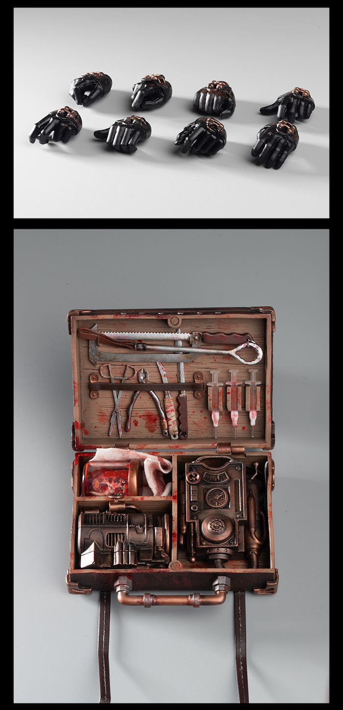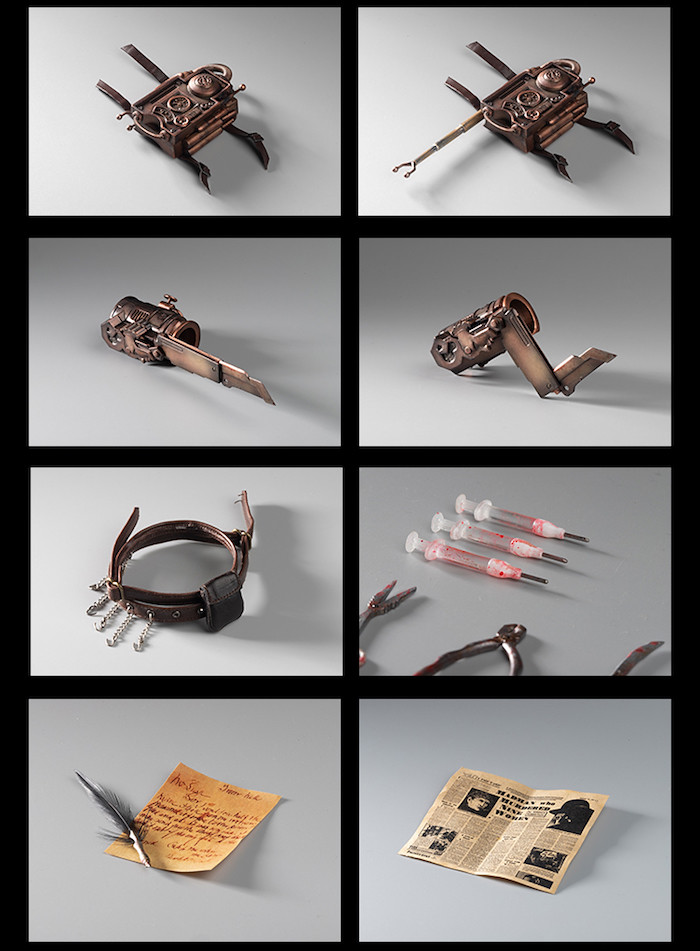 配件陣容超豐富的~細緻的收納箱、左手的伸縮電叉、右手的折疊刀都帶有蒸氣龐克的風格,各式犯案的工具更一應俱全!匕首、手術刀、鉗子、針筒注射器、透明儲物瓶、剪刀、鋸子......等,實在好獵奇呀~而且許多工具還可以掛在腰帶上,使這款人偶更添恐怖氣息!除了令人毛骨悚然的工具外,還附屬多個替換手、報紙、羽毛筆、「來自地獄」的信件與半顆腎臟!