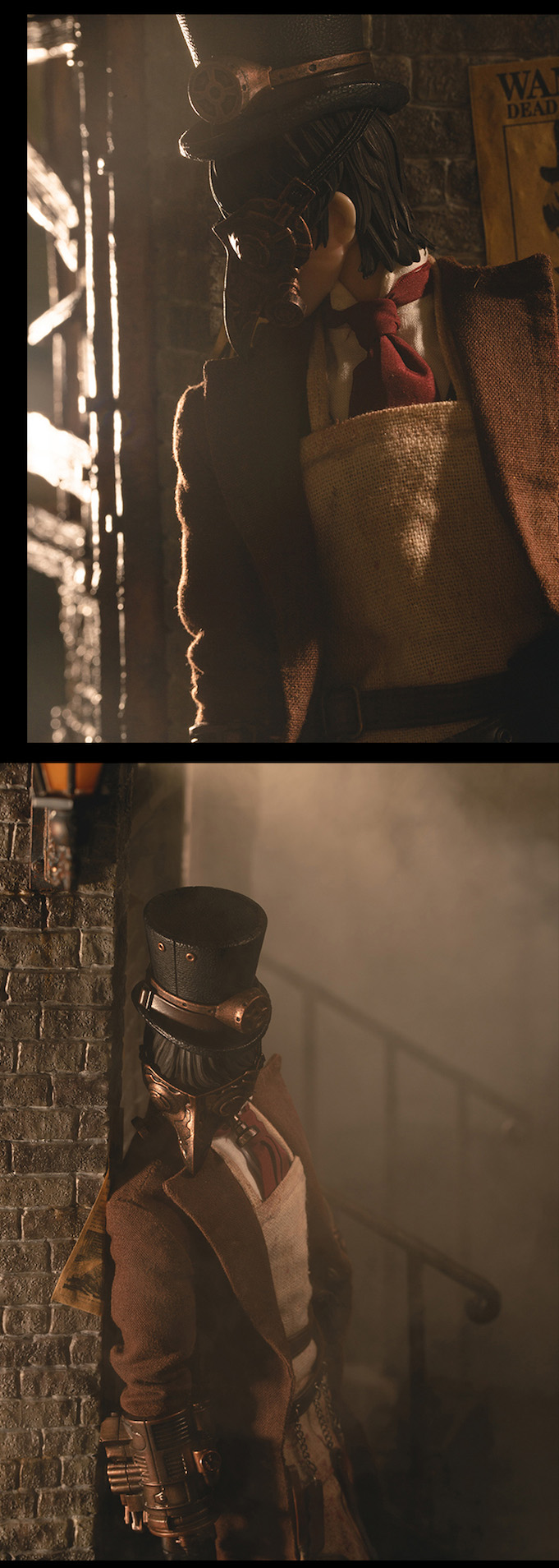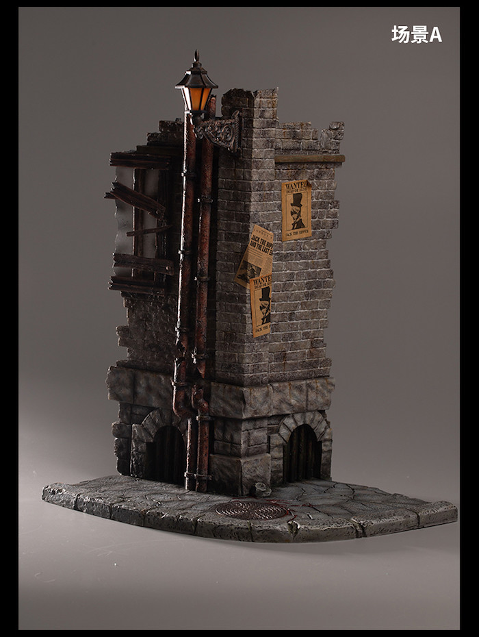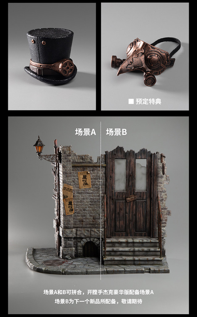 豪華版則追加了一款街角的場景地台,骯髒的磚牆、外露且生鏽的管線都施以細膩的造型刻畫,路燈還具有點亮功能!另外,預購特點是帶有蒸氣龐克風格的「鳥嘴面具」,想入手的玩具人要多加留意歐~