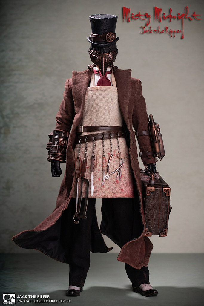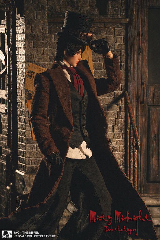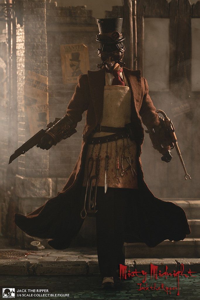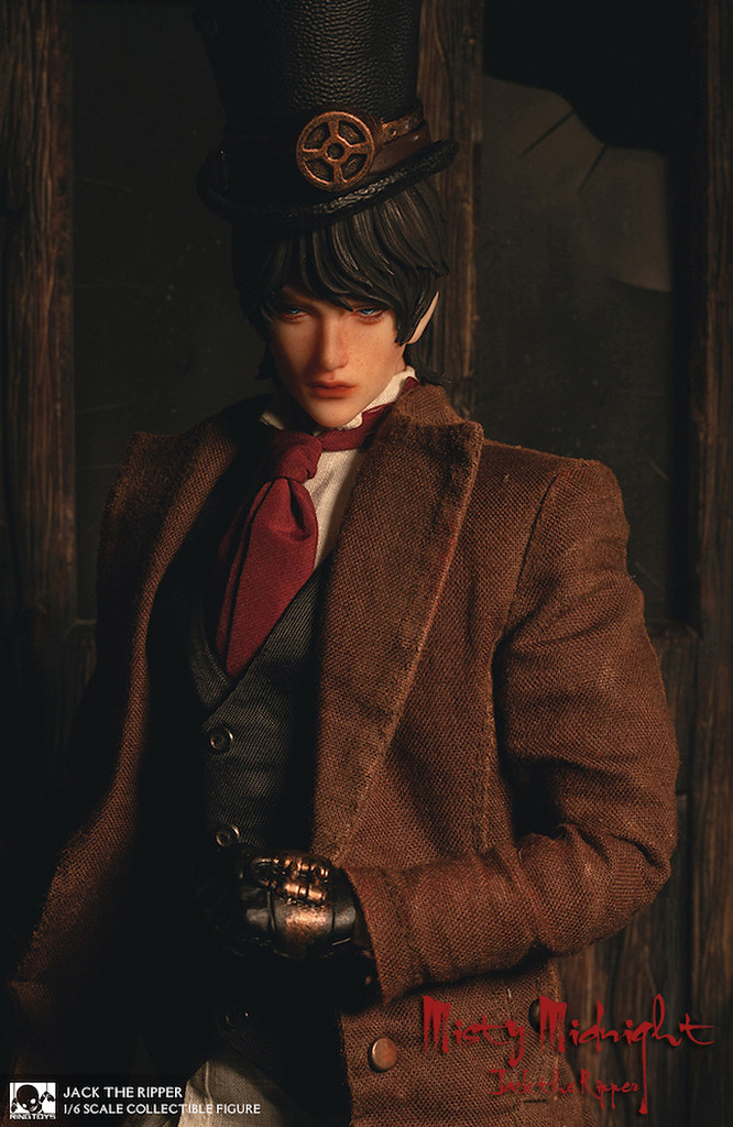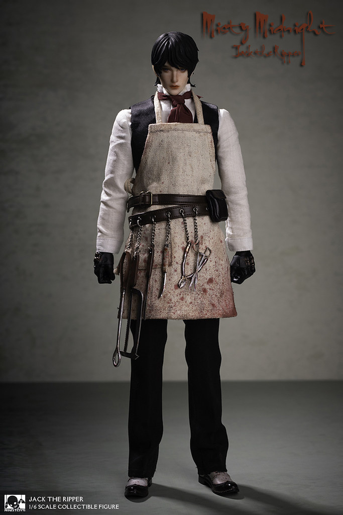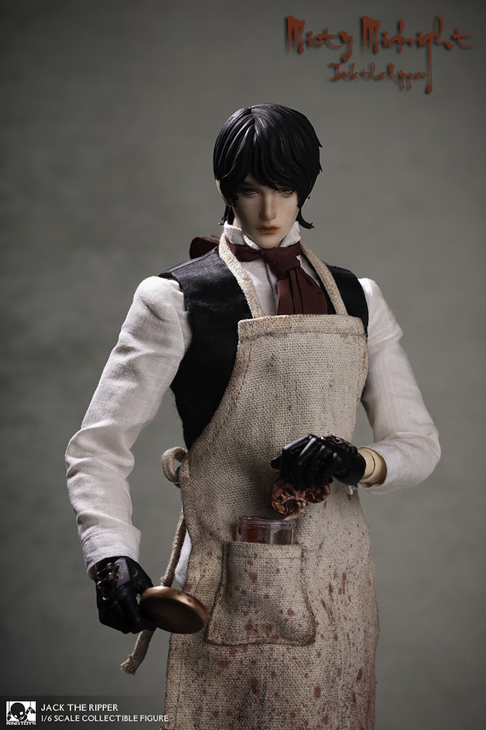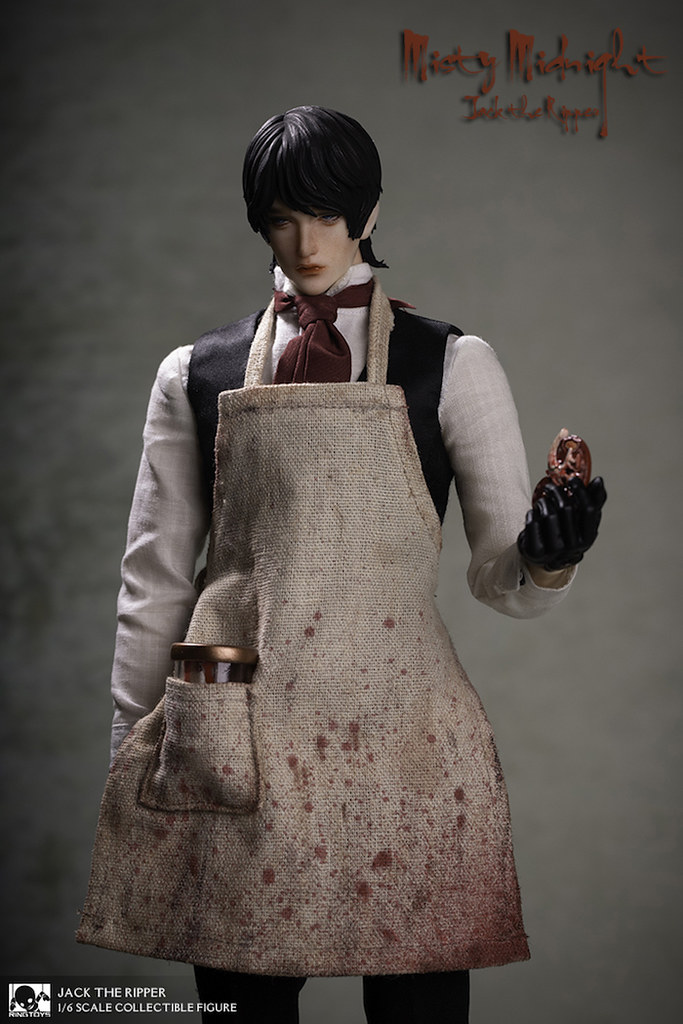 開膛手傑克是在19世紀時震驚倫敦、以極為殘忍的手法殺害多名女性的恐怖連環殺手之稱號,撲朔迷離的案情、媒體的大肆渲染、始終成迷的真兇,讓開膛手傑克成為史上最具知名度的殺人犯之一;而御座文化的故事《午夜迷霧》也是以開膛手傑克為主角!本作形塑出帶有病態、陰柔氣息的頭雕,身穿白襯衫外還有一件黑色背心,搭配黑長褲和酒紅色領巾,圍裙、鞋子都沾染血跡,棕色大衣與蒸氣龐克風的紳士帽讓整體造型更加多變