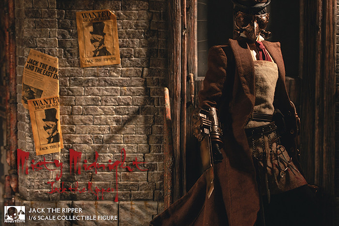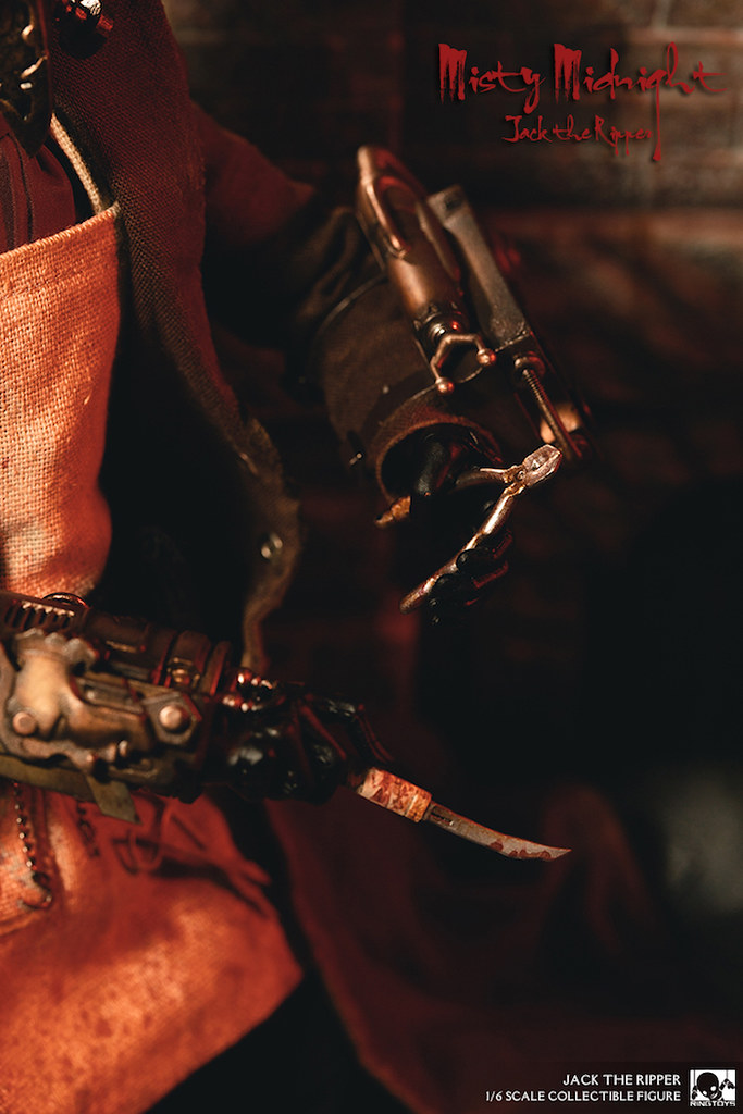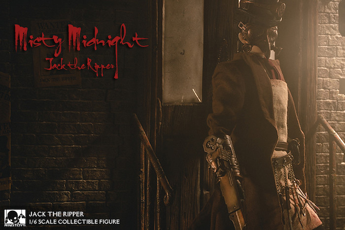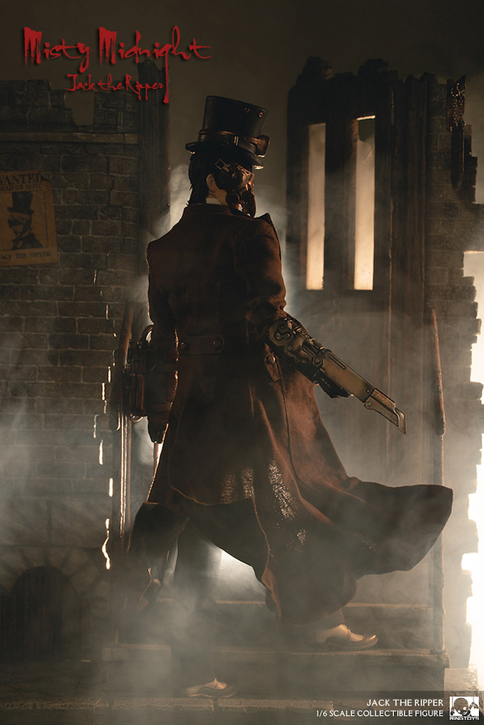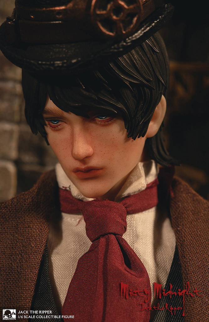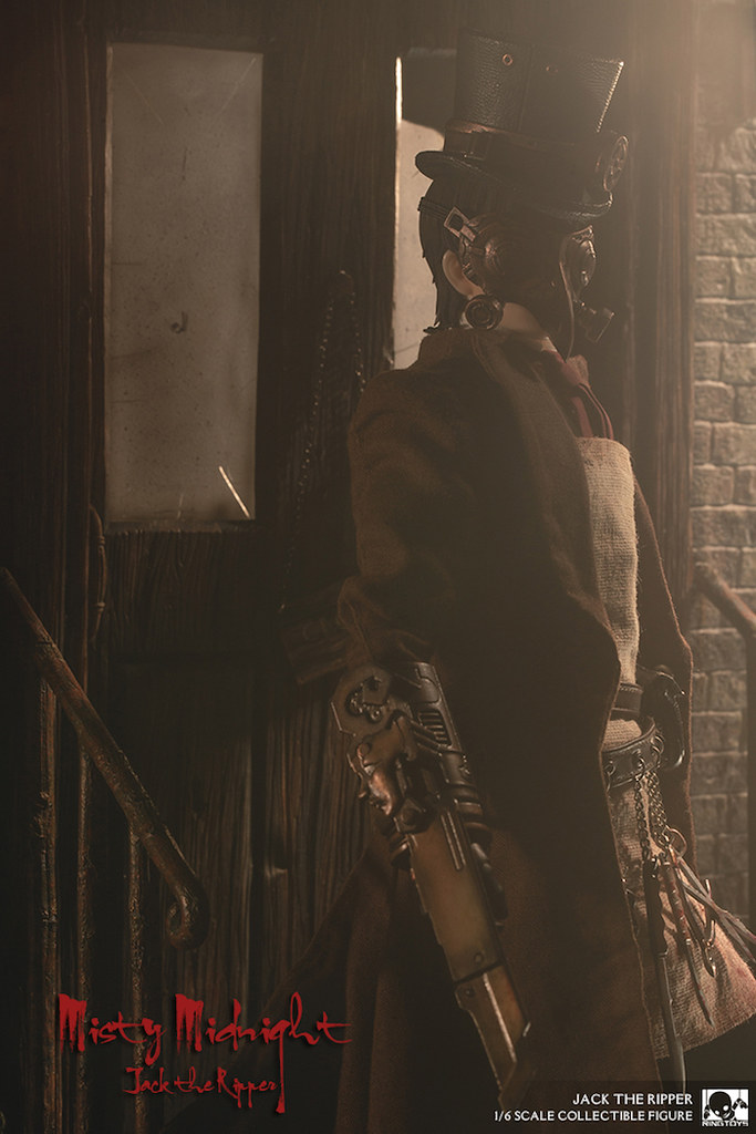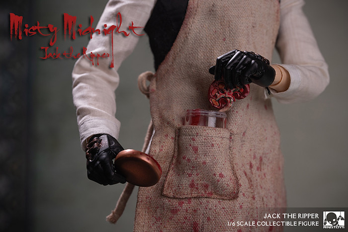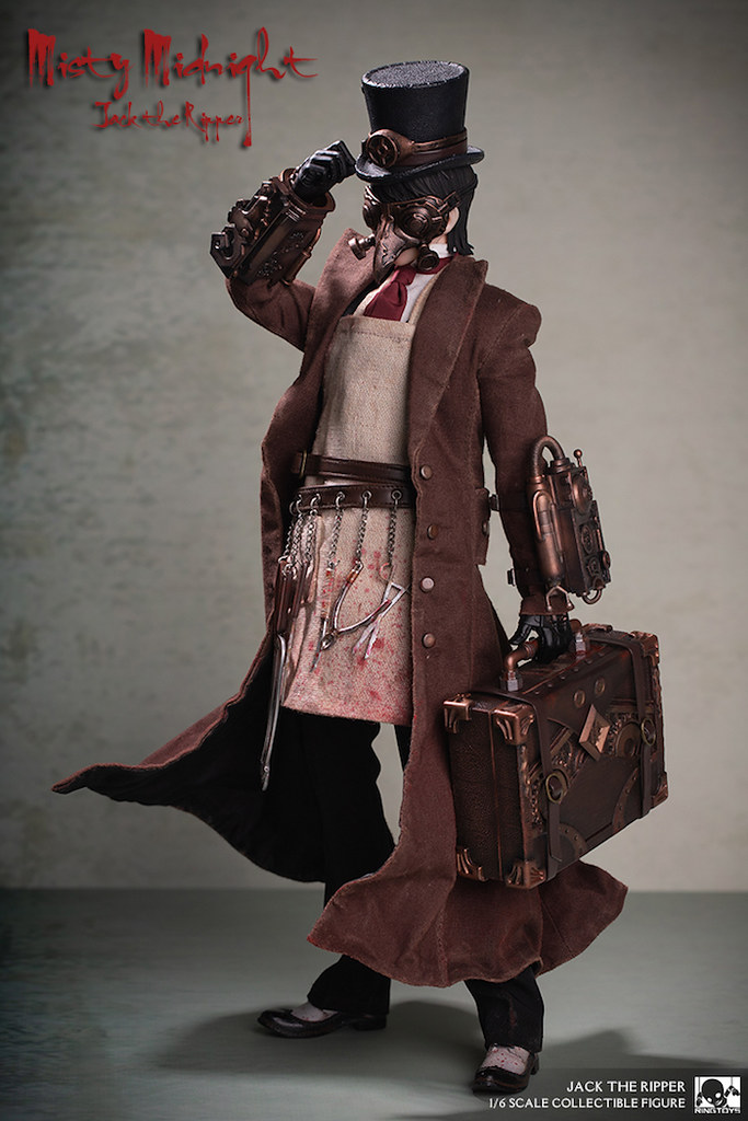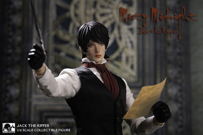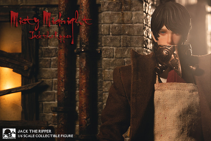 開膛手傑克是在19世紀時震驚倫敦、以極為殘忍的手法殺害多名女性的恐怖連環殺手之稱號,撲朔迷離的案情、媒體的大肆渲染、始終成迷的真兇,讓開膛手傑克成為史上最具知名度的殺人犯之一;而御座文化的故事《午夜迷霧》也是以開膛手傑克為主角!本作形塑出帶有病態、陰柔氣息的頭雕,身穿白襯衫外還有一件黑色背心,搭配黑長褲和酒紅色領巾,圍裙、鞋子都沾染血跡,棕色大衣與蒸氣龐克風的紳士帽讓整體造型更加多變