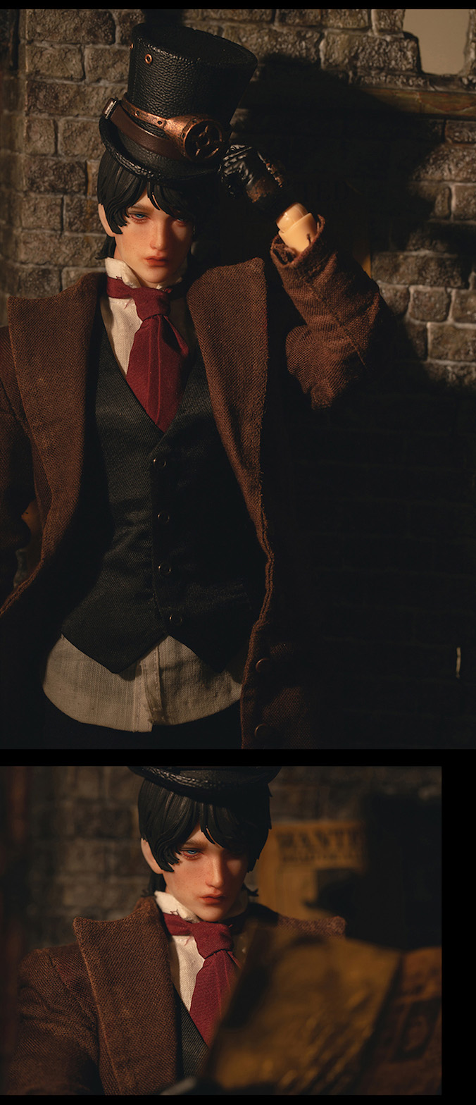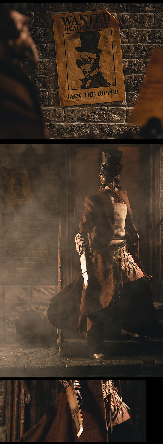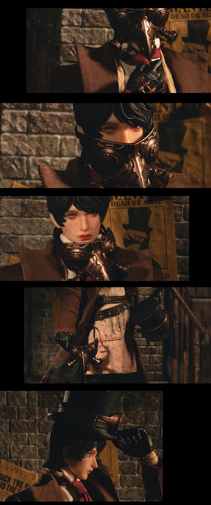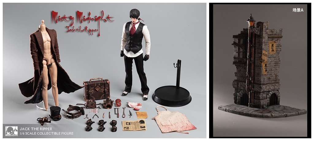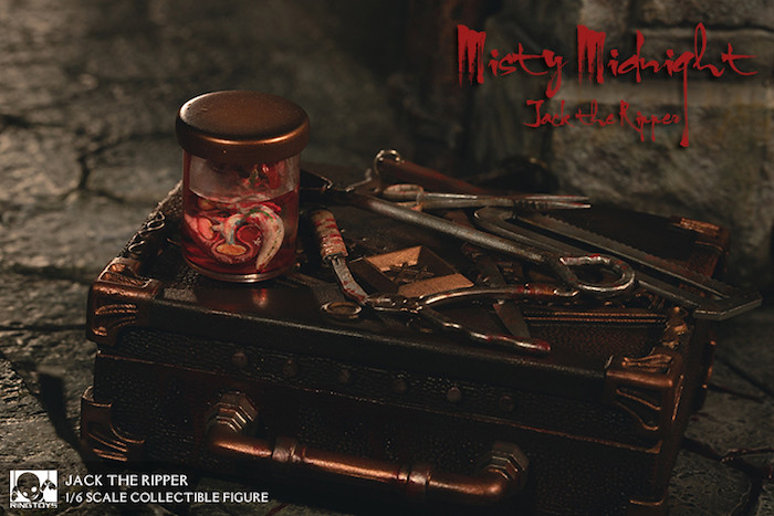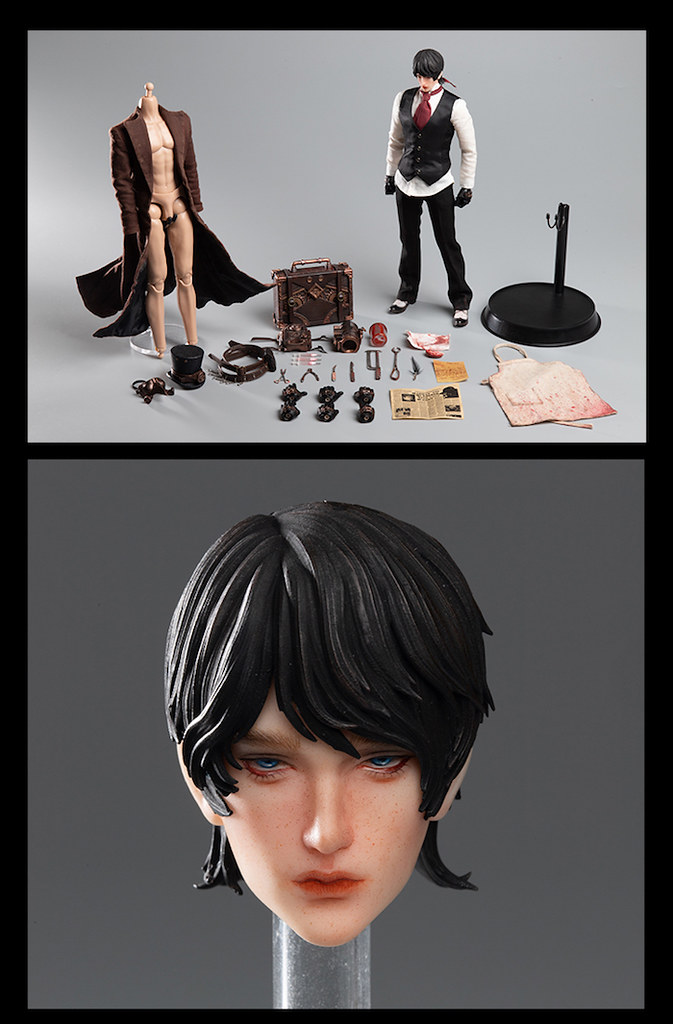 開膛手傑克是在19世紀時震驚倫敦、以極為殘忍的手法殺害多名女性的恐怖連環殺手之稱號,撲朔迷離的案情、媒體的大肆渲染、始終成迷的真兇,讓開膛手傑克成為史上最具知名度的殺人犯之一;而御座文化的故事《午夜迷霧》也是以開膛手傑克為主角!本作形塑出帶有病態、陰柔氣息的頭雕,身穿白襯衫外還有一件黑色背心,搭配黑長褲和酒紅色領巾,圍裙、鞋子都沾染血跡,棕色大衣與蒸氣龐克風的紳士帽讓整體造型更加多變