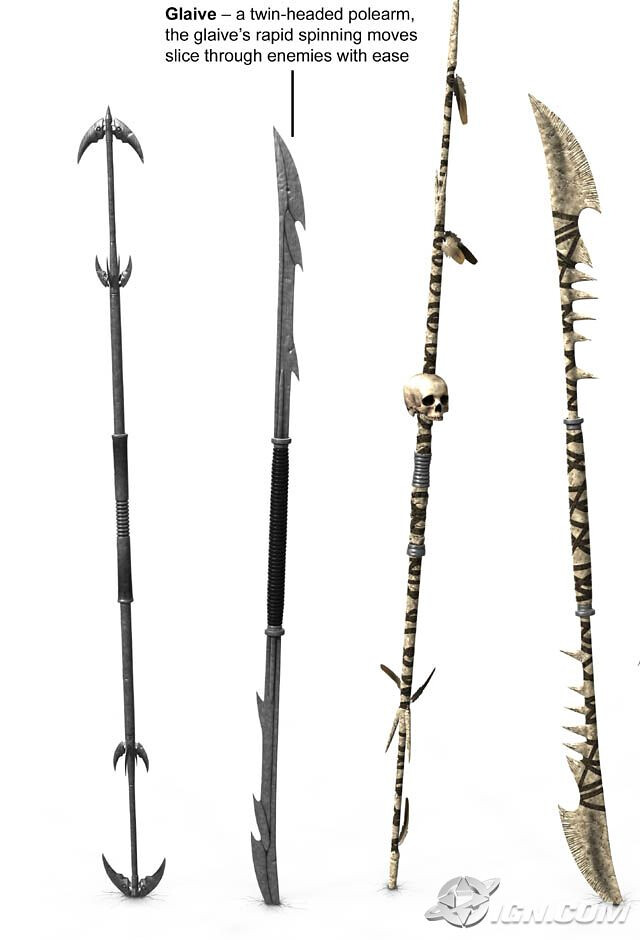 Glaive(長刀):可以說是伸縮矛的近戰改良版,所以永遠不會當作遠距離武器給拋出去,而要使用這類武器是需要相當敏捷的戰士才能發揮出最大效果,更有等離子斧頭和等離子長刀版本,使其更容易穿透對方防禦。