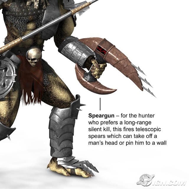 Speargun(矛槍):比起等離子砲和智能碟刀,矛槍是一個無聲且不需要浪費能量的遠距離攻擊武器,類似人類的釘槍。不過值得注意的是,跟許多終極戰士武器有個人風格客製化不同,矛槍基本上都保留著原本樣子,只是有推出跟護手連結的衝鋒槍、手持的短槍、步槍、狙擊槍….等不同型號罷了。