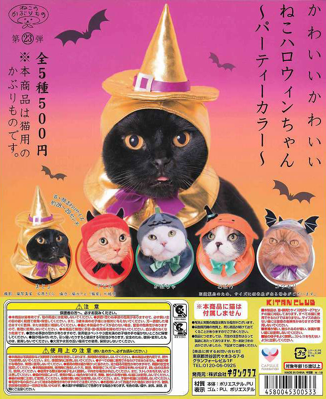 在第18彈「復活節版」、第19彈「糖果版」、第20彈「水果版2」、第21彈「熊熊版 柔和色調」、第22彈「貓的水族館2」之後,日本搞怪轉蛋廠牌奇譚俱樂部旗下熱門的「可愛貓咪頭套」系列轉蛋在第23彈再次以萬聖節為題,推出「可愛貓咪頭套 萬聖節貓~派對配色~」(かわいい かわいい ねこハロウィンちゃん 〜パーティーカラー〜),預計將於2018年9月上旬發售!!