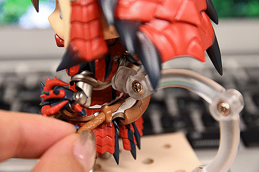 「黏土人 獵人♀雷烏斯裝」以最新作《魔物獵人:世界》的設計為基礎,將身穿火龍套裝的女獵人打造成可愛的黏土人,表情零件附有神情堅毅的「普通臉」、勇敢的「戰鬥臉」。整套火龍裝施以光澤的紅黑色漸層、亮銀金屬色塗裝,呈現火龍甲殼的光澤感與金屬的重量感,層次豐富。還有腰部的蟲籠、可拔出的「剝取用小刀」等細膩配件。武器則是遊戲中相當多玩家愛用的火龍大劍「赤紅之翼(Red Wing)」,雖然是可愛的2、3頭身比例,但拿起大劍後還是相當帥氣!