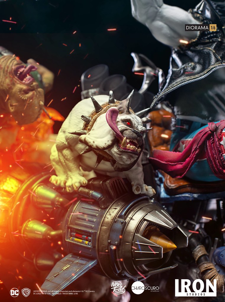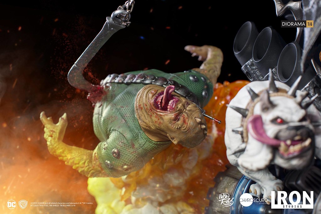 「暴狼 by Ivan Reis 1/6 比例全身場景雕像」高約38 公分,全長則來到驚人的81 公分,有著極為震撼的視覺效果,將他瘋狂、嗜血的形象精準詮釋,從髮型、妝容、服裝、機車都有著濃厚的重金屬搖滾樂元素,誇張的造型與厚重感十足的金屬塗裝絕對會讓Lobo 的粉絲大呼過癮!肚子還插著鐮刀,以及被狠踹的兩位外星人,完美襯托出了Lobo 的暴力,頭雕共有三種造型可以替換,一旁還有吐著超長舌頭的外星鬥牛犬「Dawg」,排氣管噴出的火焰與大量的煙霧被細膩地刻畫,眾多細節等著玩具人們去欣賞啊!