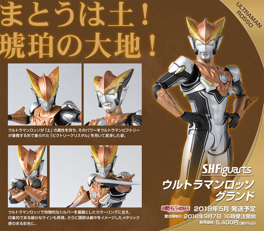 日Bandai萬代玩具公司以S.H.Figuarts可動系列來推出《超人力霸王》特攝劇集當中所登場的力霸王角色作品,之前以今年2018年暑假7月所播映的《超人力霸R/B》特攝劇集為題材,已經公開劇中登場的「超人力霸王Rosso 火型態」、「超人力霸王黑暗歐布」等等作品,將繼續推出「超人力霸Rosso 土型態(ウルトラマンロッソ グランド)」(名稱暫譯),官網日前公開其宣傳照片以及販售相關資訊。
