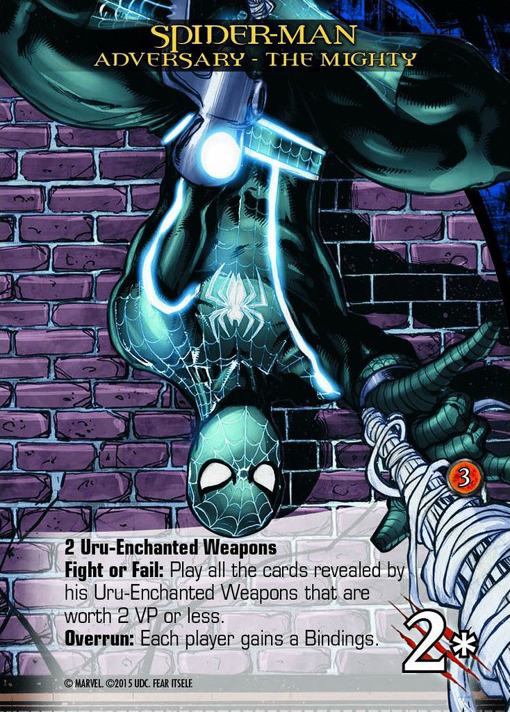在大事件《Fear Itself》中,許多超級英雄獲得了由東尼史塔克所贈與的特殊裝甲,這是由東尼與Nidavellir(尼德威阿爾)所聯手打造。 蜘蛛人的戰甲使用了與雷神之鎚同樣的材質“烏魯金屬(Uru)”所製作,並附有特殊的護手,上面設置了特製的刀刃能夠發射,服裝上的蜘蛛網線會發出淡淡的藍綠色光芒。 但可惜的是,最後這套戰服被奧丁命令銷毀。