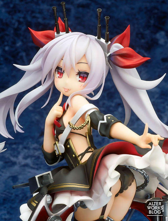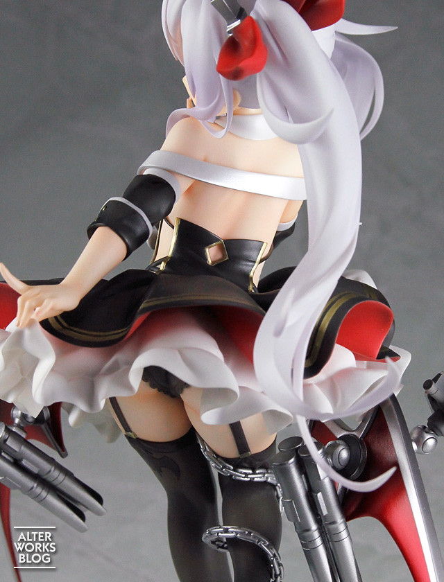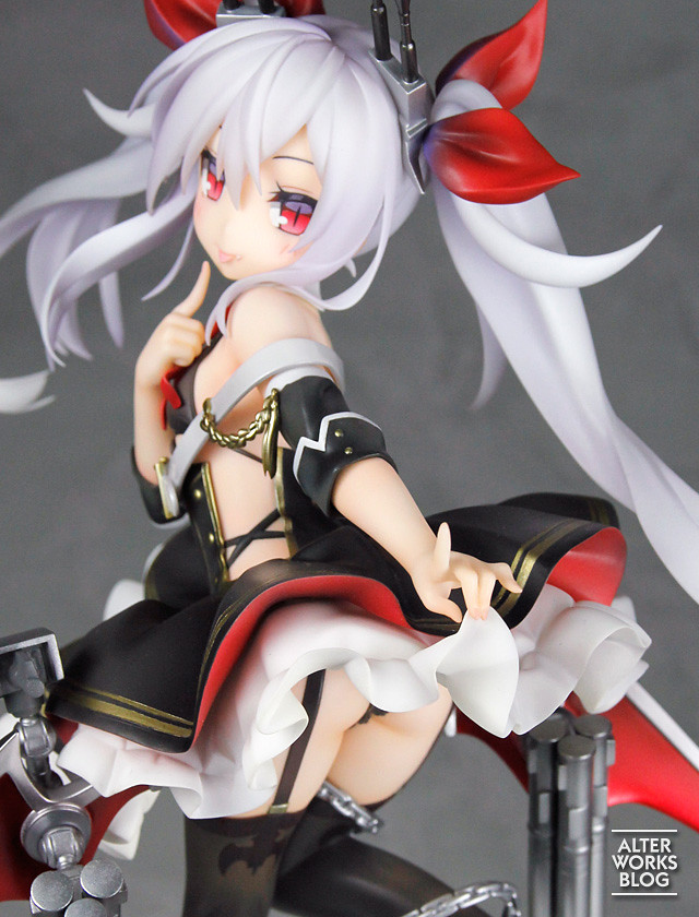「吸血鬼 1/7比例模型」以遊戲中的角色立繪為基礎製作,將吸血鬼誘惑地撩起裙襬,輕吐舌露出小惡魔般調皮笑容的模樣立體化。整個身形曲線呈現 S 型,並且塑造出背部、大腿等處肌膚的柔軟與肉感,搭配纖細的手指造型更表現出吸血鬼的個性。飄起的雙馬尾造型相當自然、躍動,而服裝部份呈現輕薄質感並有相當高水準的塗裝,除了熟悉的金色線條外,艤裝與纏繞腿上的錨也使用厚重的金屬色塗裝,整體質感極佳!