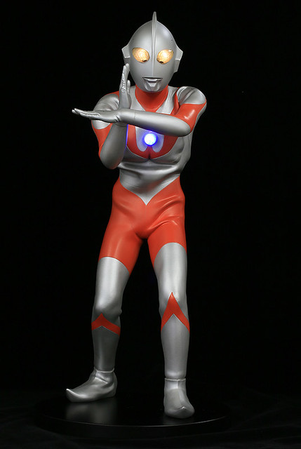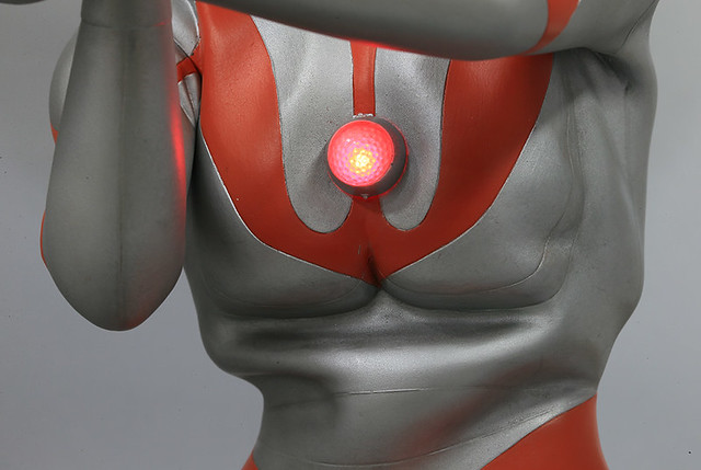 同時也將劇中眼睛部份會發光的樣貌與胸口訊號標誌處來採用透明材質製作,設計有Led燈的位置可以開啟發光裝置,並且以高約有43公分的巨大尺寸來呈現,還附有一個黑色圓型的專用底座,來支撐高度不小的立姿作品,喜愛《超人力霸王》特攝劇集系列的玩具人可以參考一下歐!