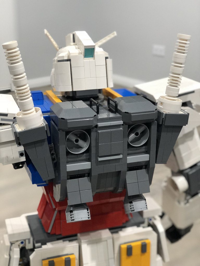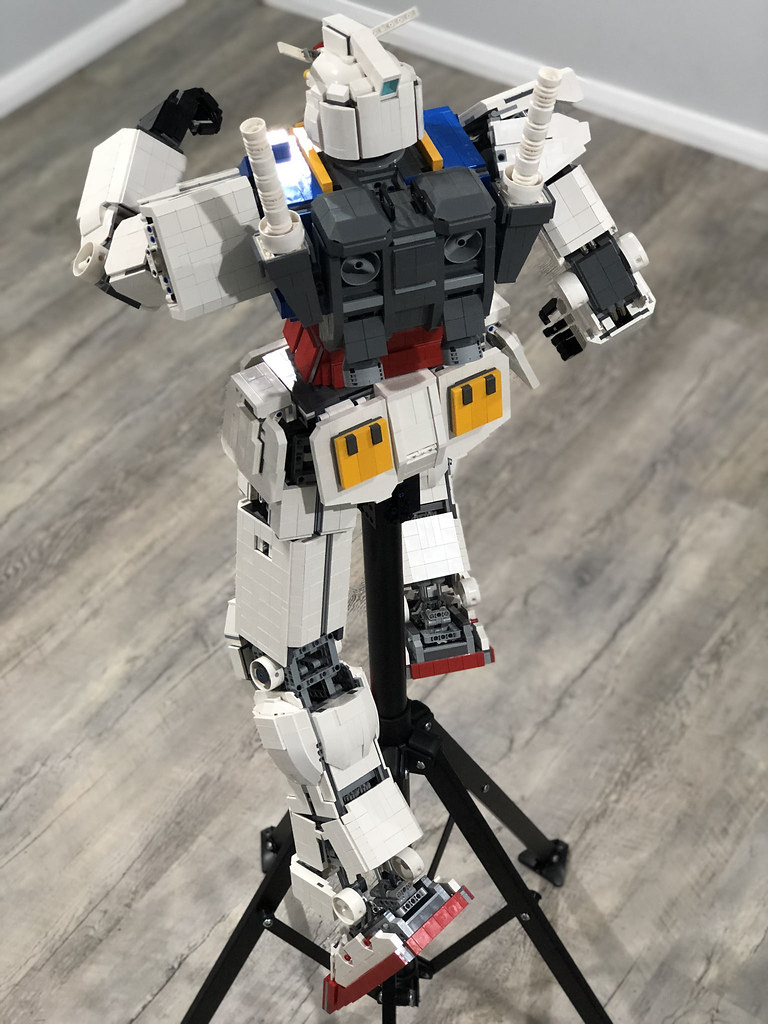 Henry Pinto 使用了超大量的平滑磚,將機體的線條完美修飾,並運用創意和各種形狀的磚再現了頭部的複雜細節、噴射背包、60mm火神砲、光束軍刀的握柄、手臂關節、手指、腿部的結構......,帥氣的頭冠更精準還原!可以用樂高做出如此精美而且巨大的模型,想必需要無數次的模擬、構思,再加上大量的耐心,值得一提的是頭部還設置了發光裝置,請....請受小編一跪啊~內部的骨架結構更是令人十分好奇,可以拆開外裝甲讓小編看看嗎?(超大力揍飛