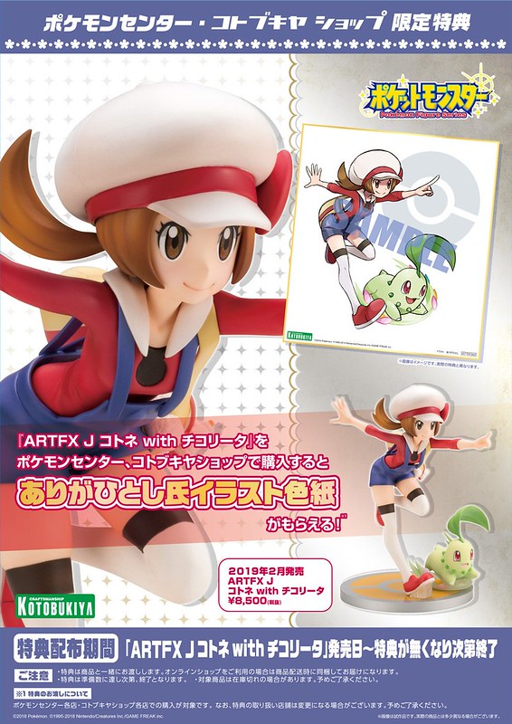 由日本壽屋玩具公司(KOTOBUKIYA)發行,打造日本動漫畫、遊戲角色精緻立體作品的「ARTFX J」系列繼「RED with 皮卡丘」、「小遙 with 水躍魚」、「莎莉娜 with 火狐狸」、「小鳴 with 藤藤蛇」、「鬥子 with 暖暖豬」、「美月 with 木木梟」、「青綠 with 伊布」後,今(18)日再度發表了出自《精靈寶可夢 心金.魂銀》的第 8 彈商品「ARTFX J 琴音 with 菊草葉 1/8比例模型」預計於 2019 年 02 月發售的消息。