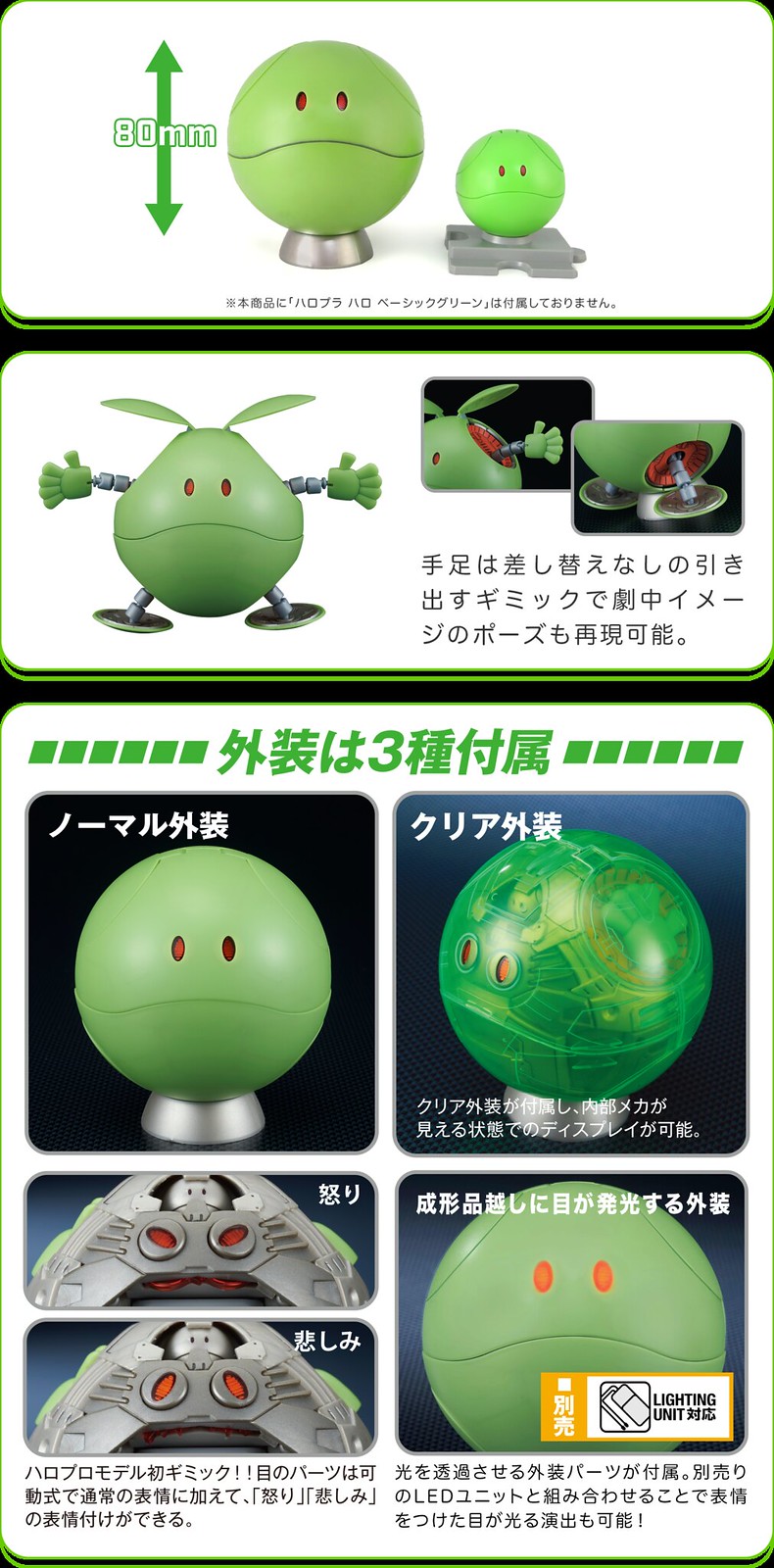 「Figure-rise Mechanics 哈囉相較先前發售的「哈囉普拉」系列更為巨大,直徑來到約 8 公分左右,精密的內構零件依據大河原邦男老師的畫稿為基礎製作,能搭配一般不透光外殼、透明材質外殼、加裝LED燈讓眼睛發光的外殼三種組裝,雙眼是能夠變更表情的可動設計,雙手雙腳更能不用替換零件直接展開!