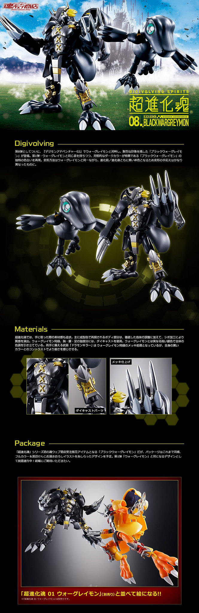 由日本 BANDAI SPIRITS 公司收藏事業部發行,以數碼獸「進化」為主題的完全變形模型「超進化魂」系列繼「戰鬥暴龍獸」、「鋼鐵加魯魯獸」、「迪亞波羅獸」、「天女獸」、「阿爾法獸」、「超比多獸」、「神聖天使獸」後,今(20)日再度發表了第 8 彈商品「超進化魂 08 黑暗戰鬥暴龍獸」預計於 2019 年 03 月發售的消息。