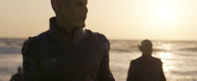 史克魯爾人登陸!!!這一幕從劇照放出來時就讓人驚訝,因為史克魯爾人最早是登場在驚奇四超人的連載裡,照理說版權是在福斯手上,但後來解釋到這種族的版權是兩者共有,不過如今隨著福斯跟迪士尼交易快成功,我們就不需要計較這麼多了,但史克魯爾人的登場加上前面的解析,或許暗示漫威第四章節會開始鋪陳《秘密入侵》大事件。