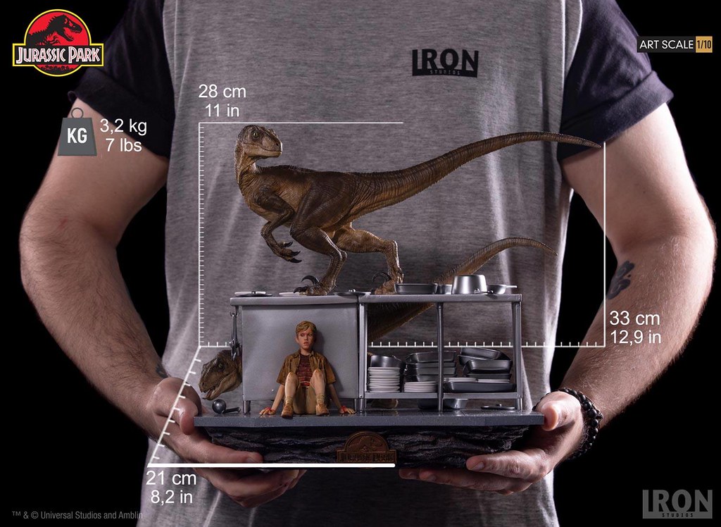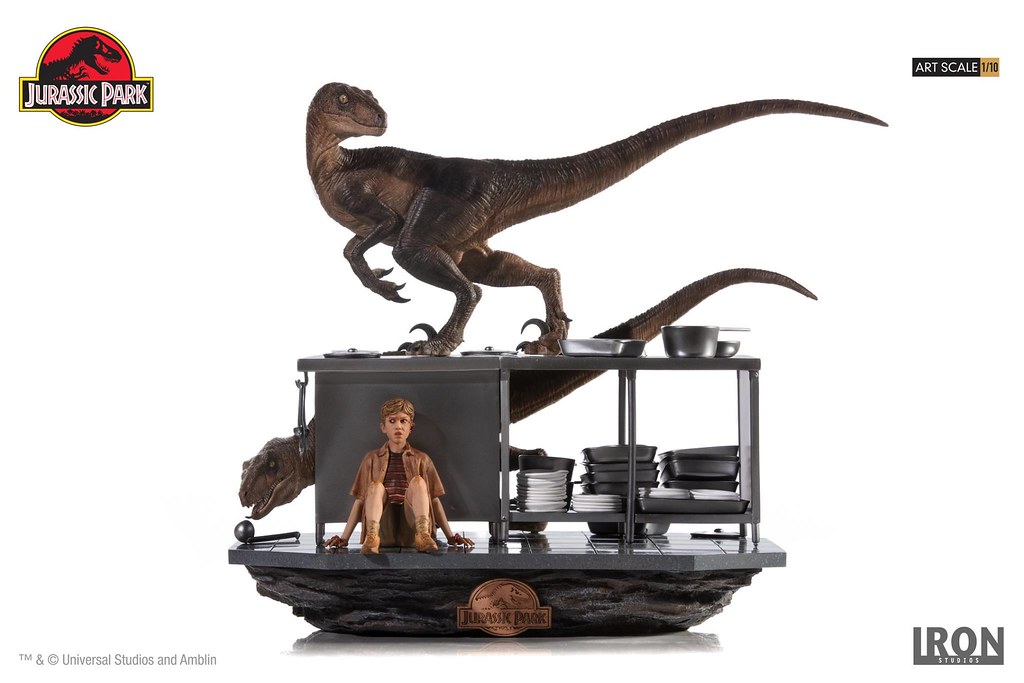 「廚房裡的迅猛龍 1/10 比例全身場景雕像」高約33 公分,將提姆與兩隻迅猛龍距離超近的緊要關頭立體化,其中一隻迅猛龍已經跳上工作台、正在四處查看,另一隻迅猛龍則是向著湯勺掉落處探頭探腦,Iron Studios 也將牠伸出舌頭的模樣完全捕捉,害怕的提姆施以精緻的造型刻畫,頭髮、舊舊髒髒的衣服、右眼上的傷痕......等皆考究還原,只是眼影似乎有點重XD,而工作台的細節也精準再現了,岩石質地的底座還有侏羅紀公園LOGO 的銅牌,讓收藏價值再提升。