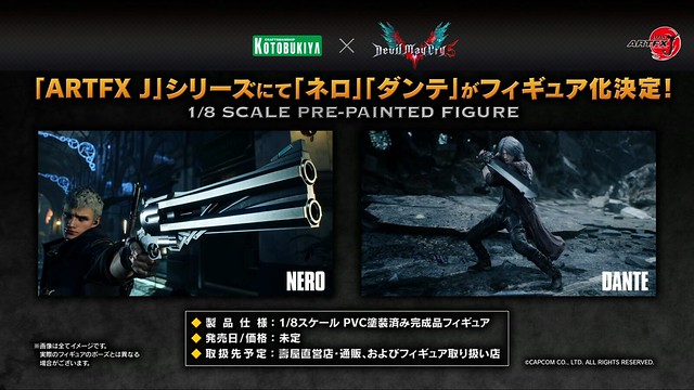 由壽屋推出的「ARTFX J 尼祿」、「ARTFX J 但丁」以 1/8 比例製作,如同遊戲中的CG造型,打造出尼祿手持「湛藍玫瑰(Blue Rose)」射擊、但丁舉起魔劍「叛逆(Rebellion)」的帥氣姿勢。