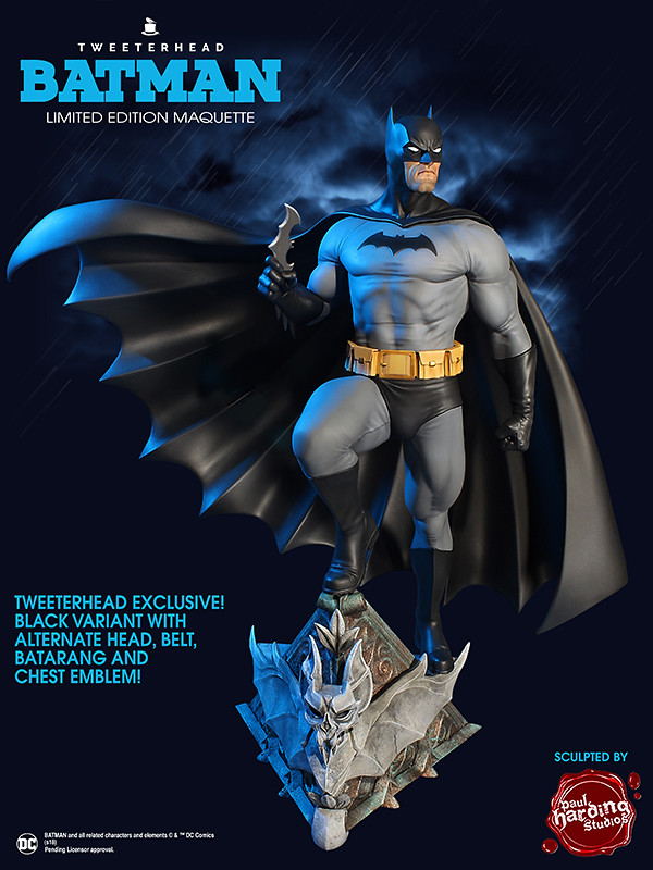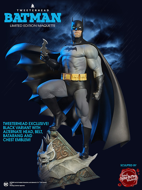 「蝙蝠俠(Batman) 黑灰配色版 1/6 比例全身雕像」全高約48.2 公分,本體的造型與Super Powers 系列編號13 的「蝙蝠俠」相同,是將藍、灰配色改為黑、灰搭配,加上搶眼的黃色腰帶,緊身衣下覆蓋的粗壯肌肉線條被細膩地形塑,緊身衣的皺褶表現增添了蝙蝠俠的動作力道,而帶有陰影效果的塗裝讓本作更具立體感,逼真的膚質紋路、招牌屁股下巴都忠實再現!