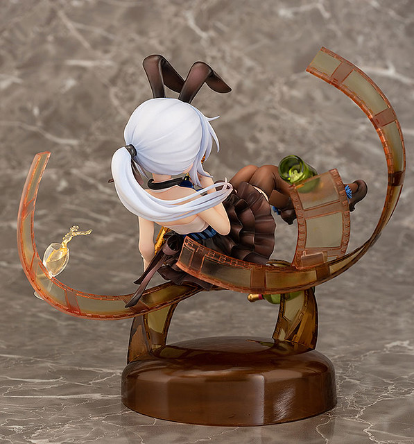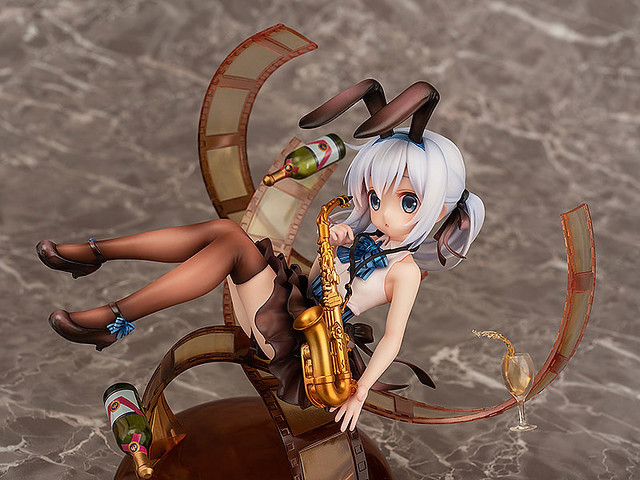 這次將「智乃」以身穿巧克力棕色為主的服裝,另外還抱著薩克斯風的模樣來呈現,有著可愛的兔耳髮箍、背部敞開的緊身無袖襯衫、位置偏低的馬尾等等,都與平時氛圍截然不同的特別造型,另外亮面的蝴蝶結與鞋子、荷葉邊輕盈擺動的裙子的漸層色澤、包覆纖細雙腿的膝上襪的透明感等等多處細節都製作出各式不同的質感,以及底座上方飄浮著底片與香檳配件,更加呈出這次作品的豪華模樣,喜愛《請問您今天要來點兔子嗎?》系列作品的玩具人可以參考一下歐!