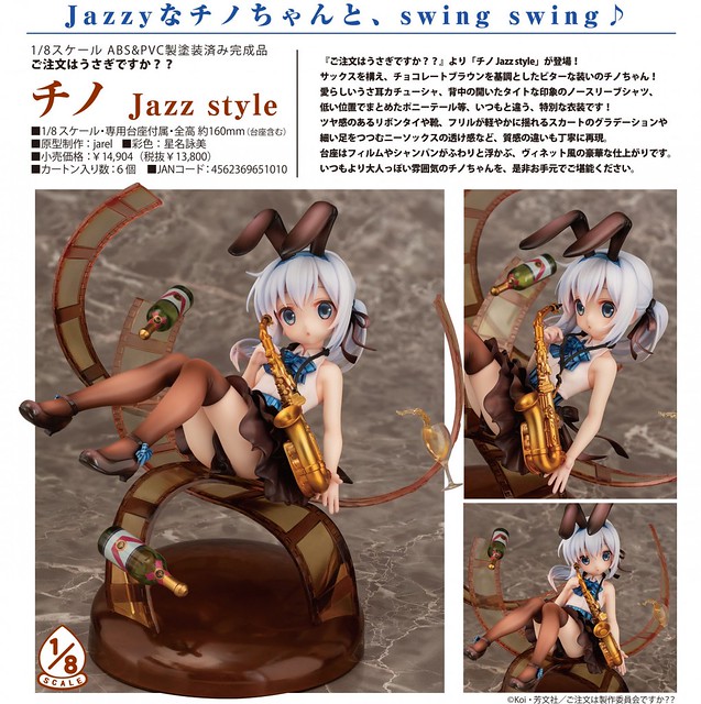 推出多款精緻美少女上色完成品的日本AQUAMARINE公司(株式会社アクアマリン),這次將以《請問您今天要來點兔子嗎??》電視版為題材來推出「智乃 爵士風格版本(チノ Jazz style)」的1/8比例上色完成作品,官網近日公開其宣傳照片以及販售相關資訊。