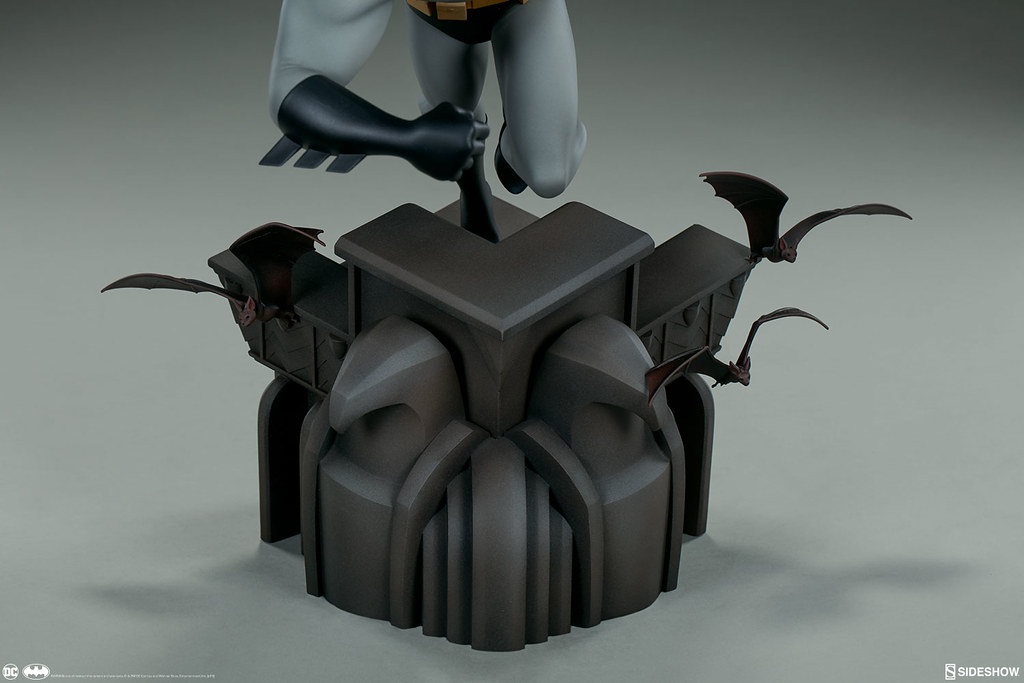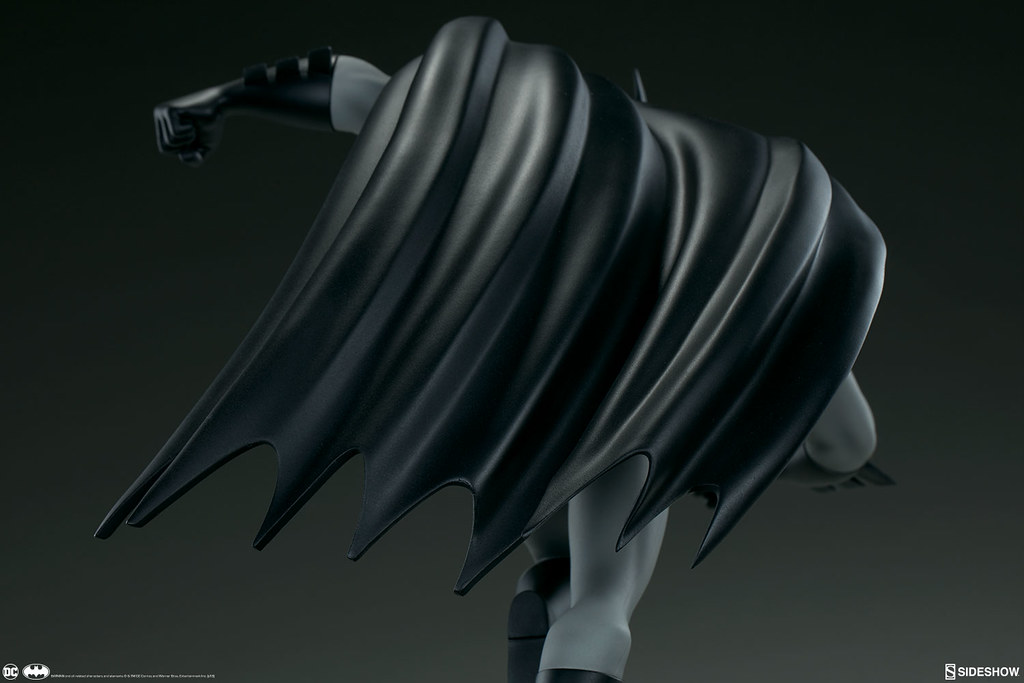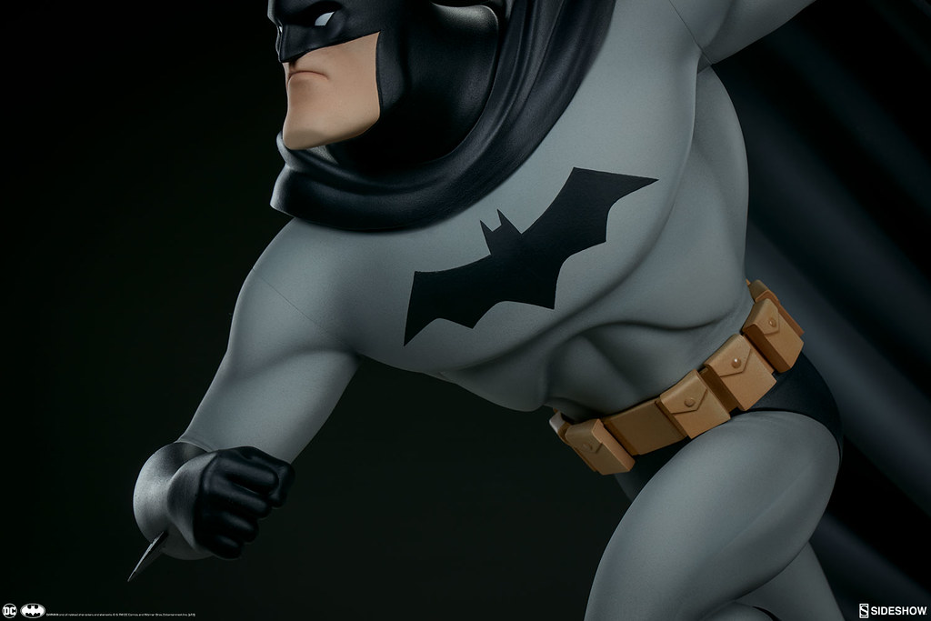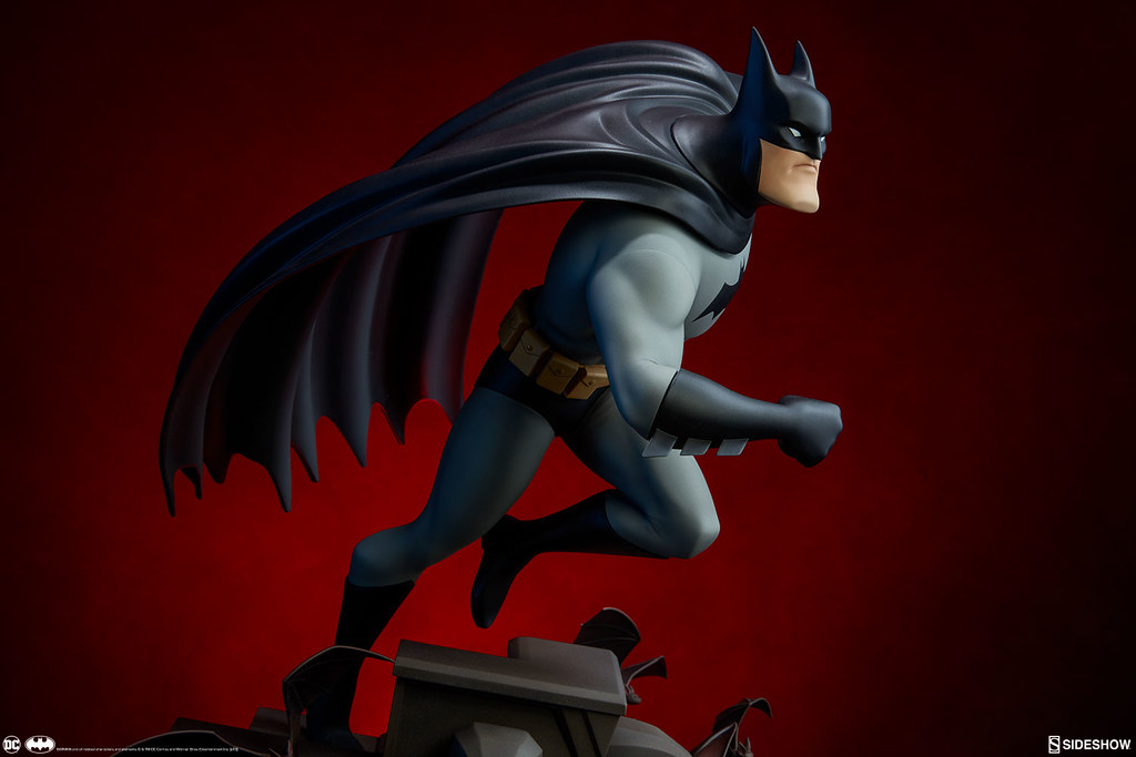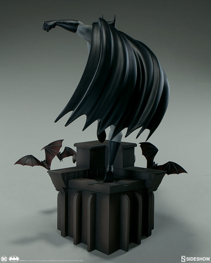 本作高約40.6 公分,重現了蝙蝠俠奔跑在高譚市高樓大廈屋頂、準備打擊犯罪的模樣,整體是採用1997~1999年《蝙蝠俠新冒險(The New Batman Adventures)》的造型來設計,黑灰配色的蝙蝠裝、多個口袋的戰術腰帶,誇張的體態、肌肉線條全都考究地還原,流線的披風讓蝙蝠俠的動作張力再提升,塗裝也相當精美!刻畫細膩的地台展現了卡通的美術風格,還有小蝙蝠在周圍飛著;而EX 版還附有握著鉤爪槍的替換右手零件喔~