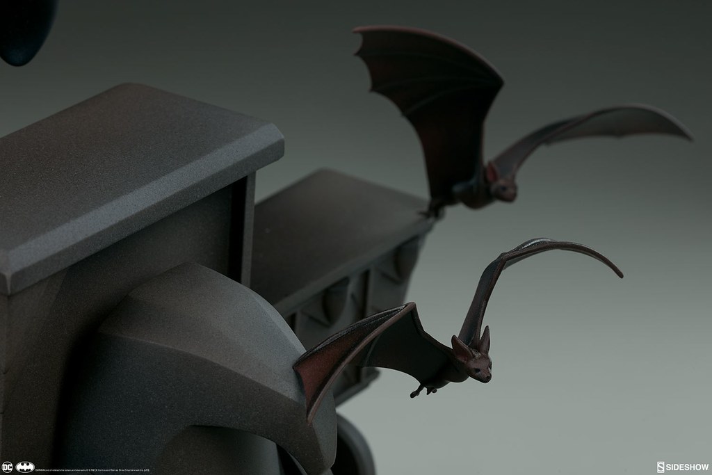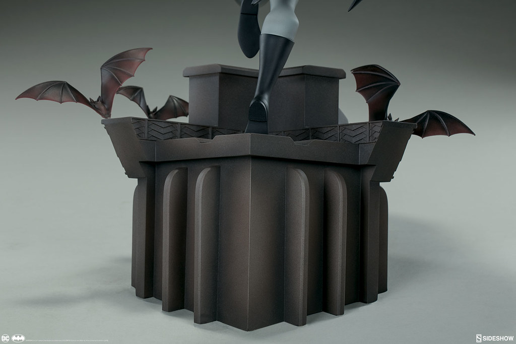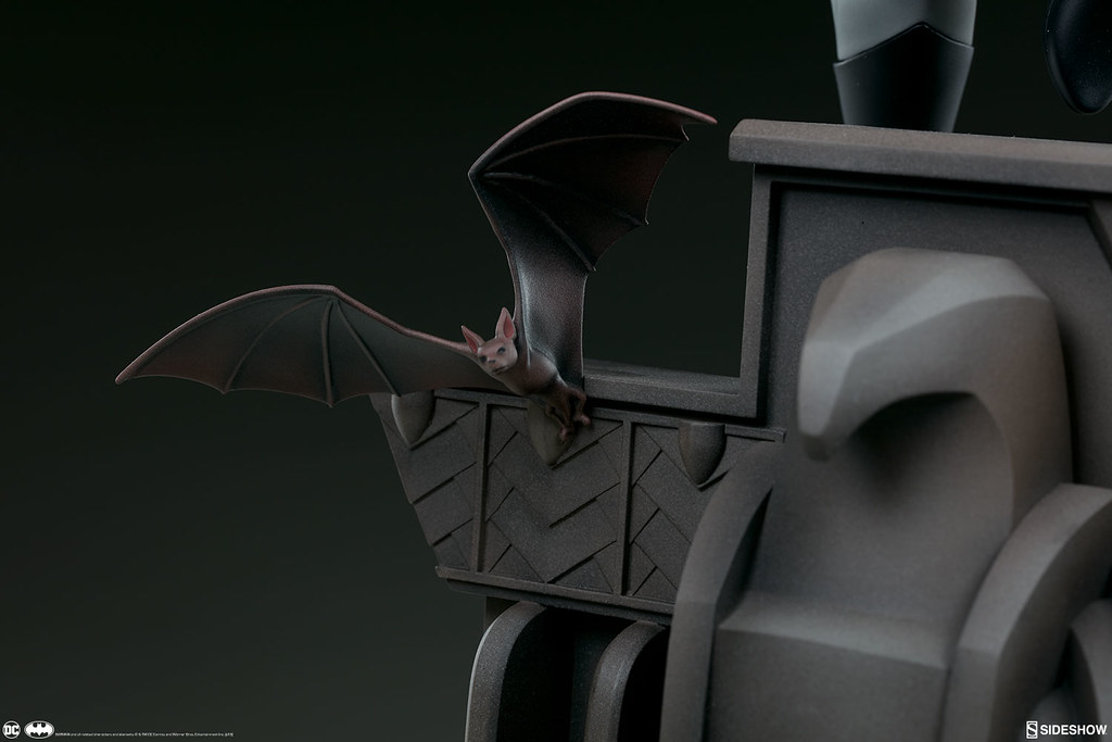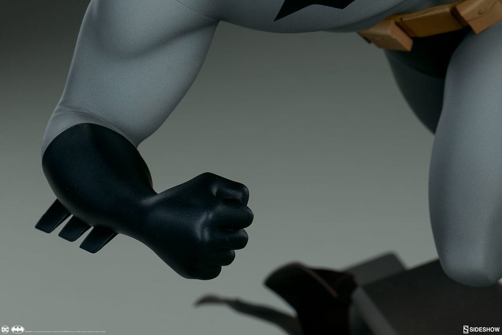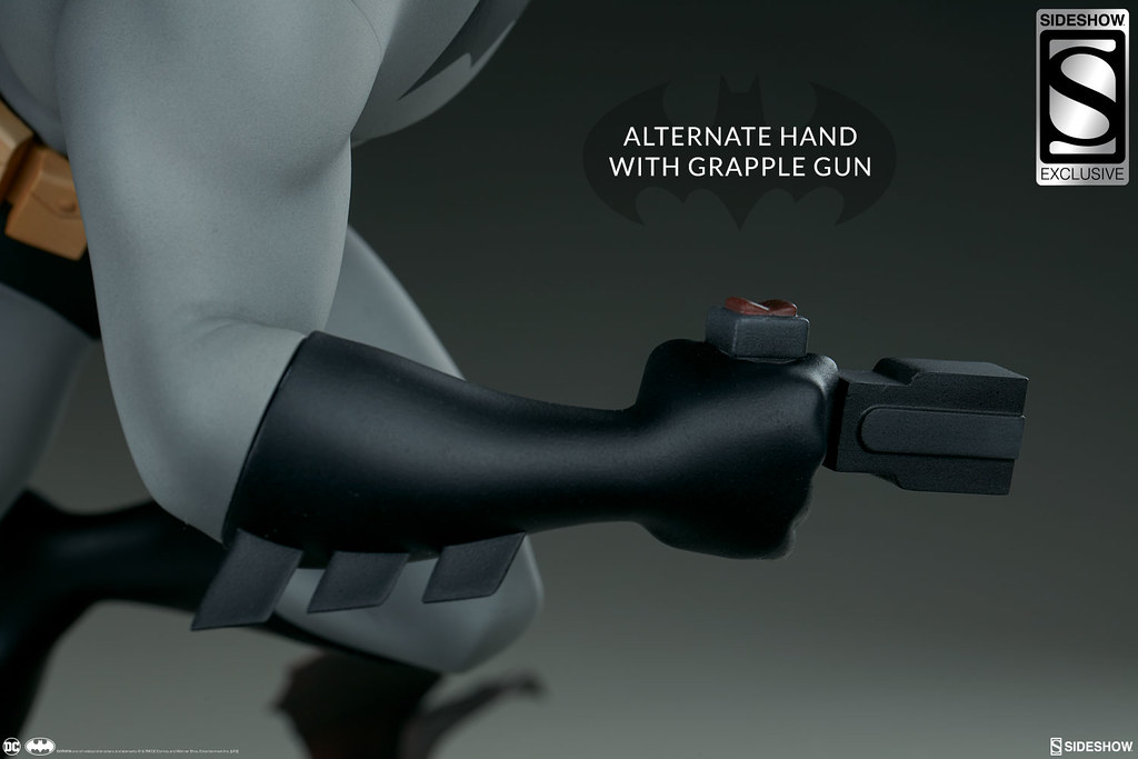 本作高約40.6 公分,重現了蝙蝠俠奔跑在高譚市高樓大廈屋頂、準備打擊犯罪的模樣,整體是採用1997~1999年《蝙蝠俠新冒險(The New Batman Adventures)》的造型來設計,黑灰配色的蝙蝠裝、多個口袋的戰術腰帶,誇張的體態、肌肉線條全都考究地還原,流線的披風讓蝙蝠俠的動作張力再提升,塗裝也相當精美!刻畫細膩的地台展現了卡通的美術風格,還有小蝙蝠在周圍飛著;而EX 版還附有握著鉤爪槍的替換右手零件喔~