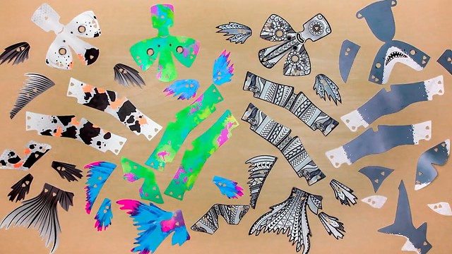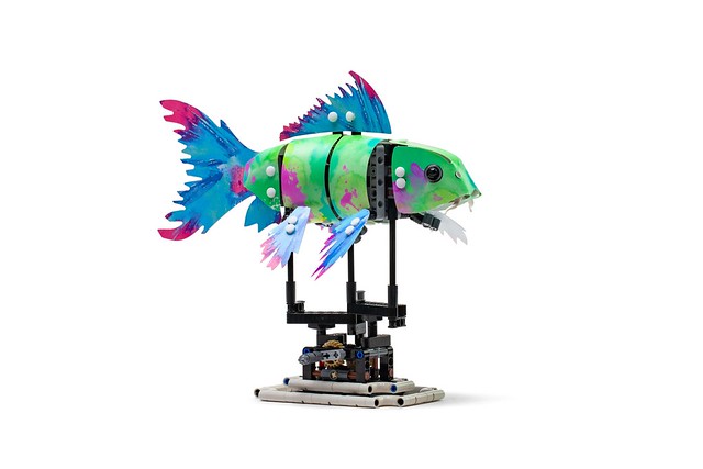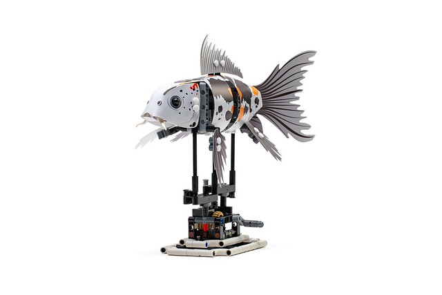 根據上圖,由左至右分別是「飛濺錦鯉(Splash Koi)」、「鯊魚(Shark)」、「錦鯉(Koi)」、「魚拓(Ink Koi)」,設計概念是用科技磚堆砌出魚的骨骼,然後套上自己所喜歡的外皮,而內部骨架與底座有連動的機關,藉由旋轉把手來賦予仿生魚樂高模型生命力,可以呈現出魚擺動身體游泳的樣子,相當有意思!魚皮方面,除了鯊魚的顏色較為簡潔之外,其他的鯉魚都繪製了豐富、細膩的圖樣。