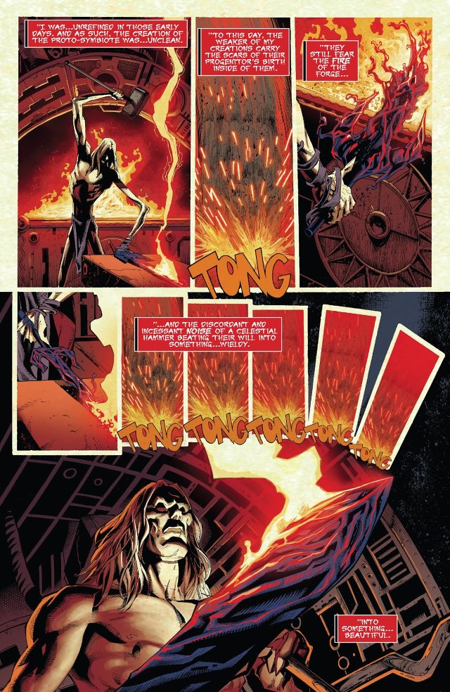 ▼ 之後Knull在那位天神族的頭顱裡開始替那把劍進行改良,由於打造所使用的火焰和聲音,讓劍不斷被敲打和重塑,使得往後每一個共生體有了怕火和聲波的弱點為其特性,這也是為何猛毒、屠殺或者其他相關造物都能用相關屬性將其打敗。隨後Knull開始了與光明征戰,並失去了那把劍「全黑死靈劍」(All-Black Nacrosword),但也讓他有了新的想法。