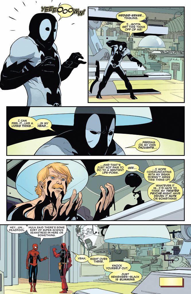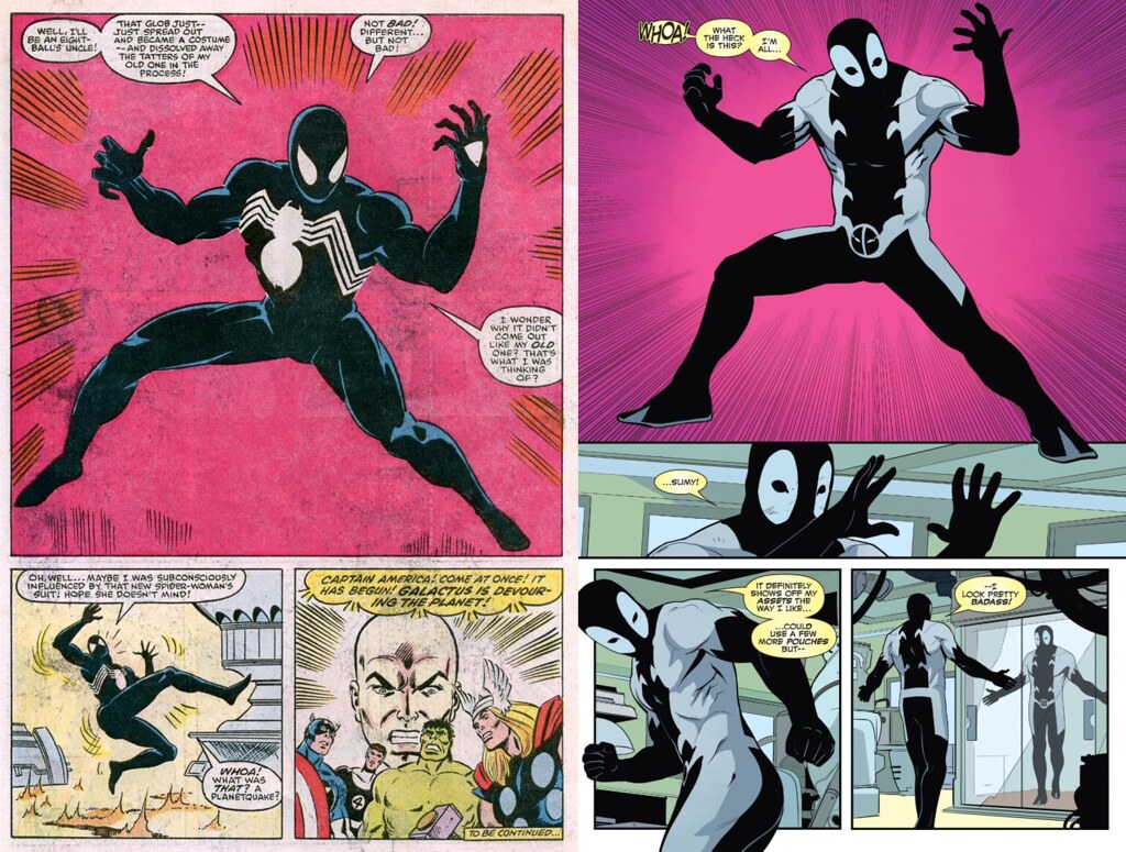 ▼ 左邊是1985年蜘蛛人首度穿上黑色服裝的經典場景,出自Marvel Super Heroes Secret Wars #8。 右邊是2015年補完劇情,揭露了其實死侍才是最初穿上服裝的人。 還故意讓死侍穿上服裝的動作致敬1985年的經典場景,出自Deadpool's Secret Secret Wars 003。