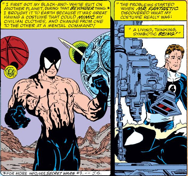 之後秘密戰爭爆發了(1985年版),死侍在戰爭世界發現了共生體,於是藉此成為宿主,但覺得這東西是活的,感覺被「性騷擾」,為此就將其脫下並推薦給同樣衣服破爛想要修補的蜘蛛人,使得蜘蛛人變成了我們所看到的經典黑色服裝。 這也是漫畫史上第一次共生體的現身。