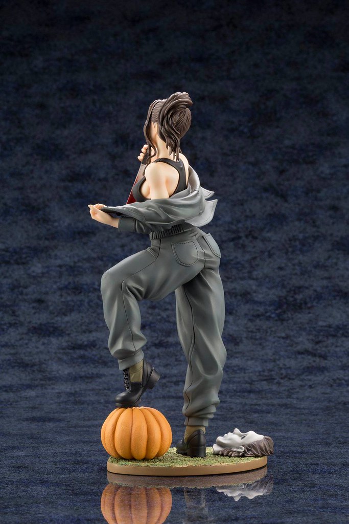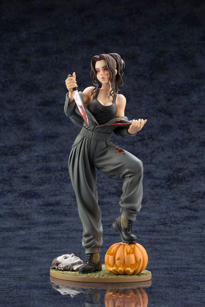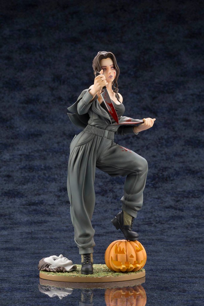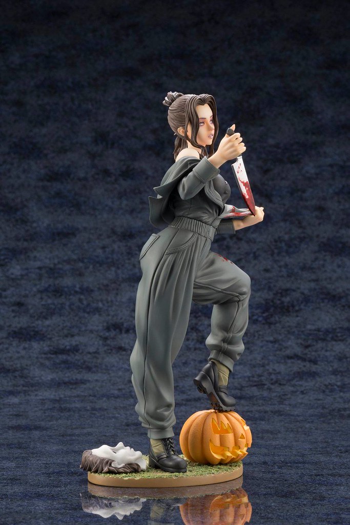 「麥克·邁爾斯 1/7 比例PVC塗裝完成品」高約23.5 公分,保留了殺人狂邁爾斯身穿工作服與手拿殺魚刀的設定,但在山下俊也獨特性轉換方式的重新詮釋下,恐怖、慘白面具底下的竟然是一位肌膚白皙、細嫩的超美麗少女,有著濃密的睫毛、淡紫色的唇膏,臉頰、殺魚刀、工作服上的血跡和眼神更添其病態的氣質,馬尾、工作服的皺折施以細膩的造型刻畫,黑色背心展露出她姣好的身材,底座還有南瓜跟經典的面具,這款火辣辣的邁爾斯絕對值得粉絲珍藏!