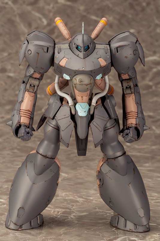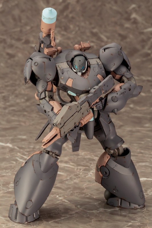 由新川洋司設計的重装甲大型FA「玄武」擁有壯碩、厚重的上肢與下半身,腰部、背部燃料罐卻是相對纖細,透過優美的曲面裝甲構築出極具份量的外型,後方噴嘴更是系列首度使用的球狀造型,讓人感受濃厚的「新川洋司」風格。此次推出的異色版本「冥武」則將成形色替換為宛如荒漠迷彩的配色,相當適合舊化效果。