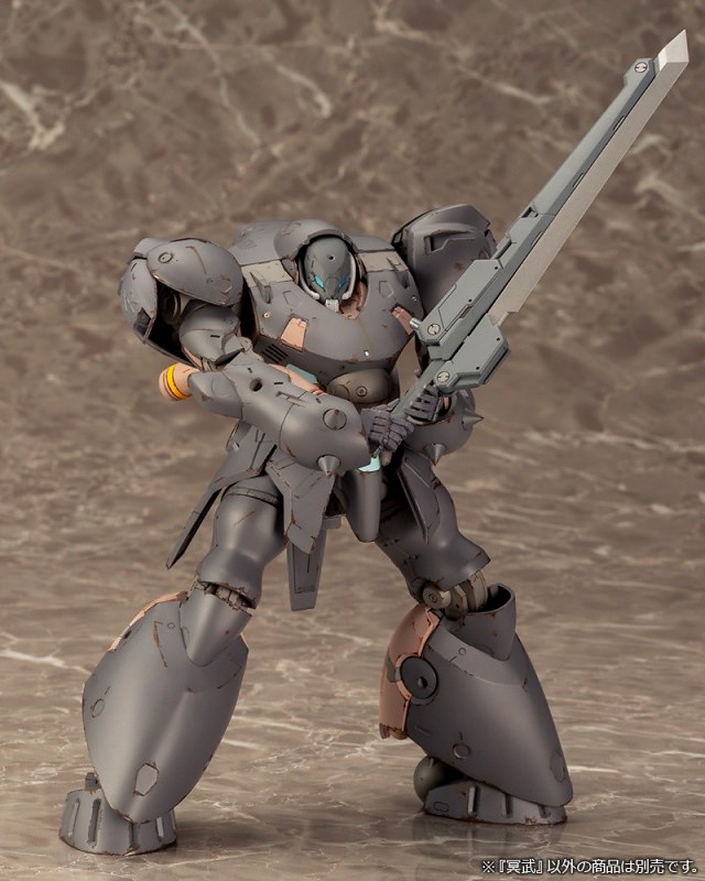 「骨裝機兵 冥武」使用的套件基本與「玄武」相同,擔任立體化原型的則是擁有多年合作經驗的原型師「堀克彦」,以豐富的表現力再現玄武的魅力。頭部天線可拆裝、小腿後方裝甲可展開,並擁有「火箭發射器」、「步槍」、「戰劍」等多種武裝!同時也融入了「骨裝機兵」系列特色,機體各處採用3mm接點、身體.腰部使用新型FA骨架,可與同系列機體換裝!
