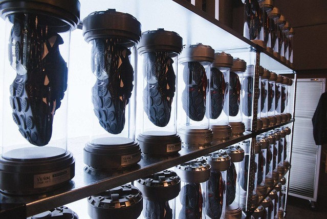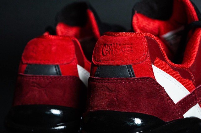 屠殺款則是以紅、黑、白搭配,鞋身有著數種不同深淺的紅色,同樣運用了複合式材質製作增添層次感,鞋跟處也有CARNAGE 的字樣與Puma 的經典LOGO;除了鞋子本體之外,最酷的地方就是如同電影中保存共生體的生化容器包裝盒,精緻外觀極具科技感,還印上聯名的字樣,更添收藏價值呀~