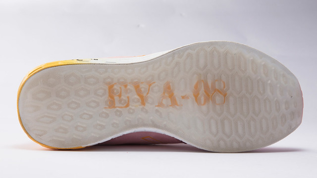 右腳是8號機的粉色,左腳則呈現出2號機的紅色,N 字框線的顏色為黃色,同樣也在側邊印上了EVA2、EVA8、A.T. Field 的字樣,穿著這雙就讓人想到在《福音戰士新劇場版:Q》中,由嚴重毀壞的8號機、2號機組合而成,各佔一半身體的「8+2號機」!