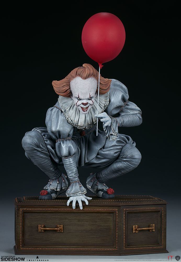 「潘尼懷斯 1/5 比例全身雕像」高約33 公分,詭異的蹲姿彷彿更添這位小丑的恐怖氣息!右手撐著地板、左手拿著紅色氣球,根據電影的造型設定再現猙獰表情與服裝,頭髮、寬大額頭上佈滿的皺紋、搶眼妝容與詭異笑容都逼真形塑,甚至還留著口水啊!小丑服裝刻畫出大量的細節,皺褶表現與細膩的舊化塗裝使本作更具寫實感!除了可以拿紅氣球之外,左手還有另一個捏起來的手勢可以替換,棺材造型的地台擁有精美的外型和仿木質感,使本作的收藏價值再提升。