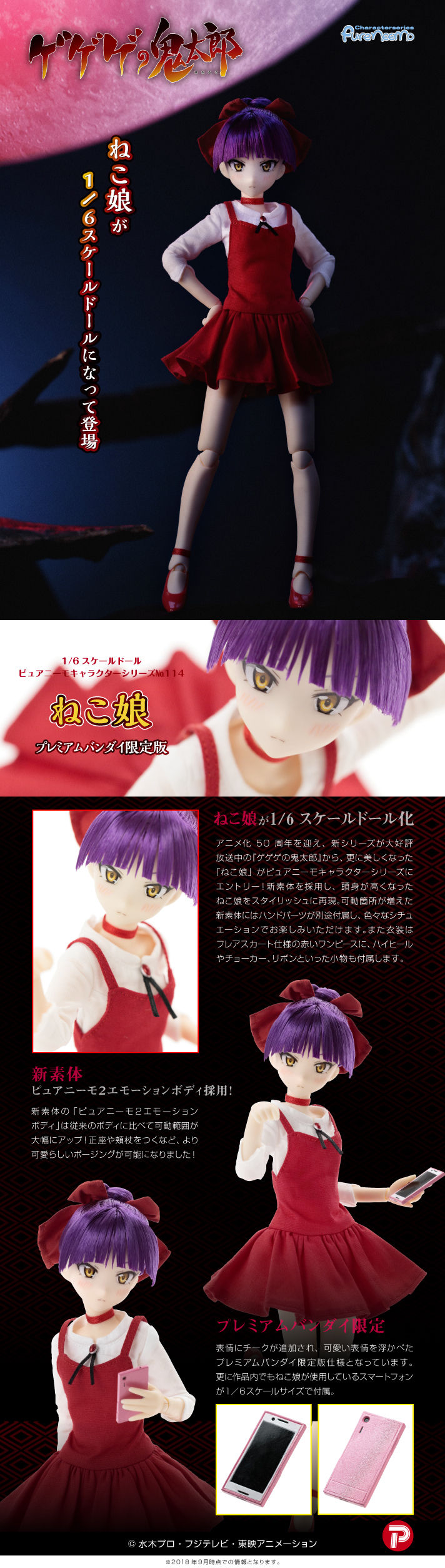 日本知名人偶(DOLL)品牌 AZONE(株式会社アゾンインターナショナル)日前發表了旗下 1/6 比例娃「Pureneemo Character」系列最新作,出自《咯咯咯鬼太郎》第六作的「No.114 貓女 1/6比例可動人偶」預計於 2019 年 03 月發售的消息。