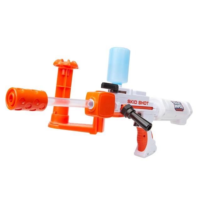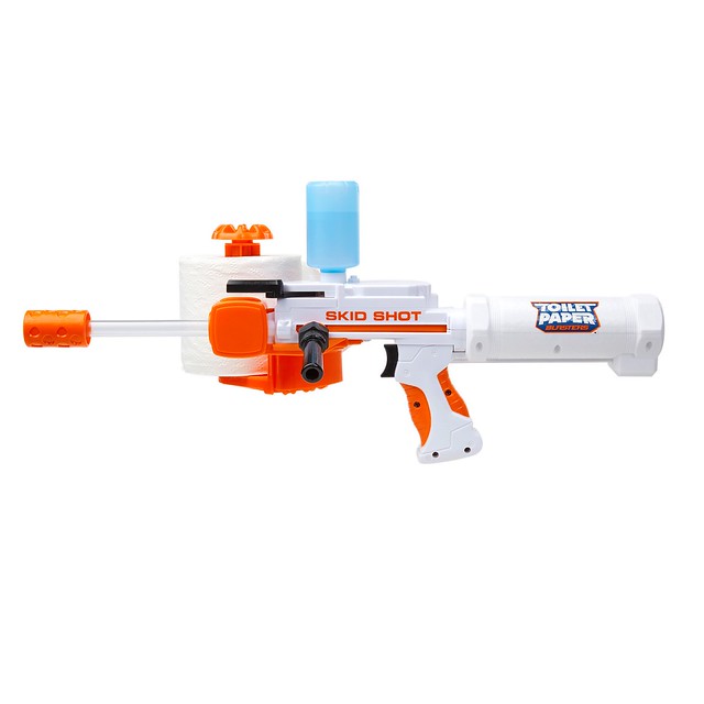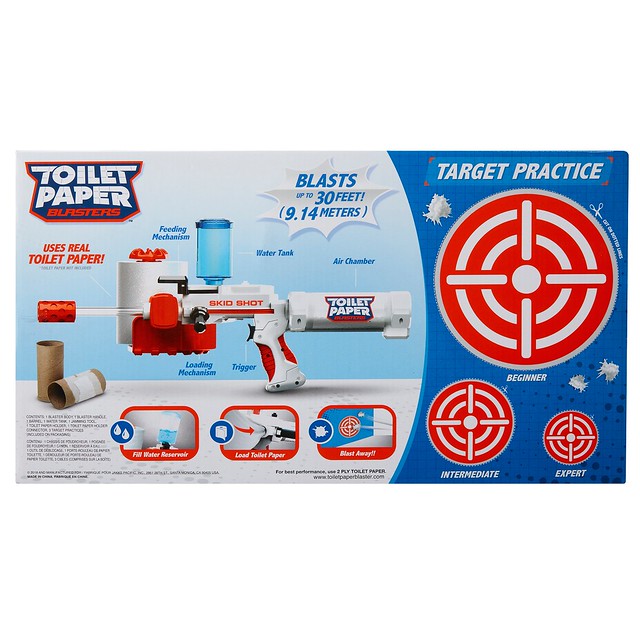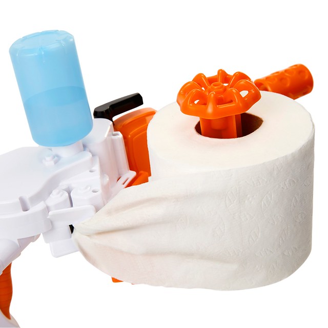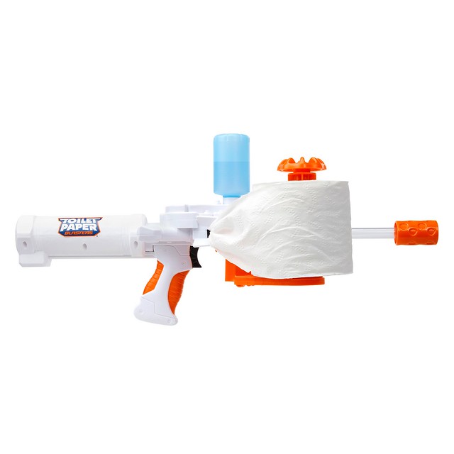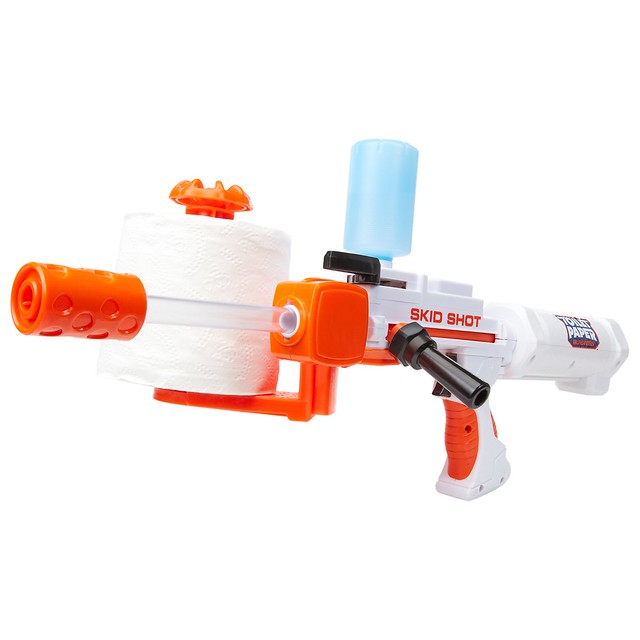 「把衛生紙撕下一角,沾一點水,揉一揉之後放到吸管前端,『咻!』一聲,黏糊糊的衛生紙球就打在你座位前面的同學頭上、天花板上,或是隨便一個地方的牆壁上。」這是不是許多玩具人的兒時回憶呢?由美國兒童玩具公司Jakks Pacific 推出的這把「廁所紙玩具槍」(Toilet Paper Blaster Skid Shot)不但能夠讓你回憶童年,還大大提高了發射衛生紙團子彈的便利、激動性!讓你在廁所紙的射擊戰爭當中無往不利XDDDDD