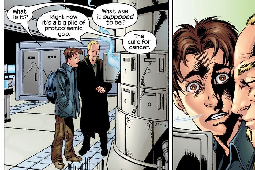 當初電影版本的生命基金會一開始是打算將共生體用在治療絕症上,這是致敬漫威終極宇宙的設定,當年美國隊長從二戰消失後,尼克‧福瑞招集了一群科學家開發新形態的超人類士兵,其中彼得的父母跟艾迪的父親一起合作,創造了一個能與人類大腦訊息交流,並因此能知道哪裡有傷痛而藉此治療的共生體。