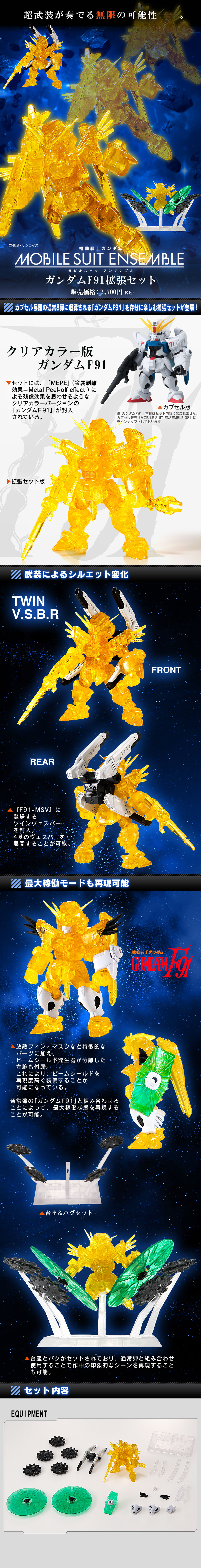 「MOBILE SUIT ENSEMBLE 鋼彈F91擴充套組」內容包含了表現出金色殘像的透明材質「鋼彈F91」、MSV武裝「雙V.S.B.R.」、展開散熱裝置的肩部、腿部、面罩零件,光束護盾、迴旋狀態的雙手光束軍刀,加上一般販售的「鋼彈F91」能換裝成最大稼動模式,此外還有 5 架無人殺戮兵器「巴克」,搭配特製台座就能再現劇中迴旋光束軍刀擊墜巴克的名場景!