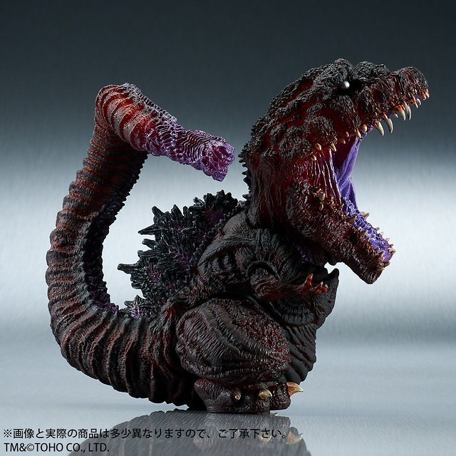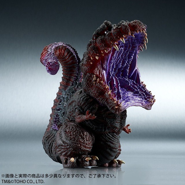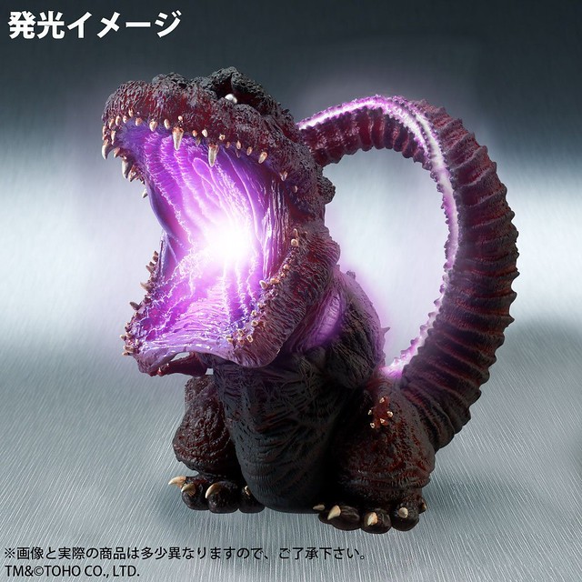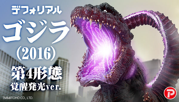 擅長以精美怪獸立體造型的日本X-PLUS公司(株式会社エクスプラス)近日發表了旗下「Q版擬真系列(デフォリアルシリーズ)」(暫時翻譯)將推出『哥吉拉(2016)覺醒發光版本 ゴジラ(2016) 覚醒発光Ver.』,系列在去年10月推出過「哥吉拉(2016) 第4型態 覺醒Ver.」的版本,這次在嘴巴開口處加上有Led燈的設計,當然同時是運用"紫色"的Led來呈現第4型態覺醒後全身散發紫光、準備發射熱線的模樣。