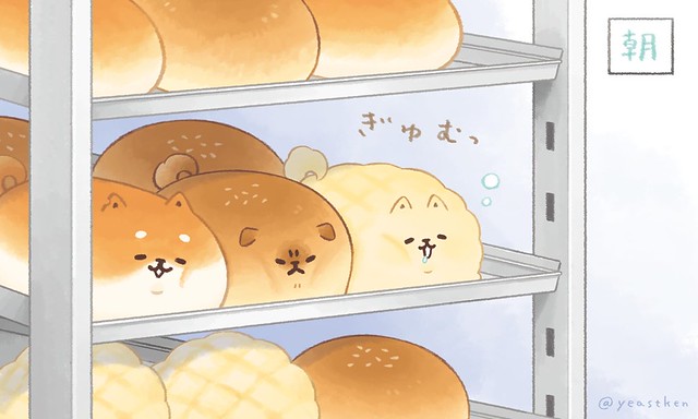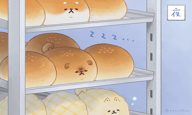 「麵包胖胖犬」 的創作者yeastken在寫著他所創作出這些麵包犬的奇幻時刻,有時候揉好麵團的時候會出乎意料地出現不太一樣的形狀,放進烤箱後直到聞到新鮮出爐的麵包,有著手感柔軟形狀像是狗狗的樣子,「我不知道它是酵母還是狗兒......?」,奇妙的生物就這樣偷偷地住在麵包店裡面了,所以就將他們取名字為「いーすとけん。(我不知道。)」。