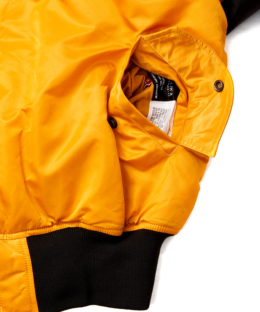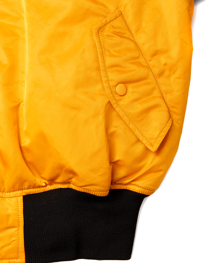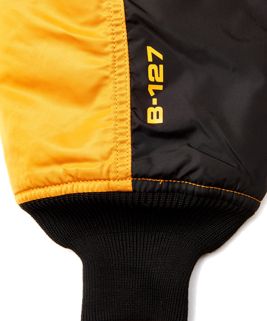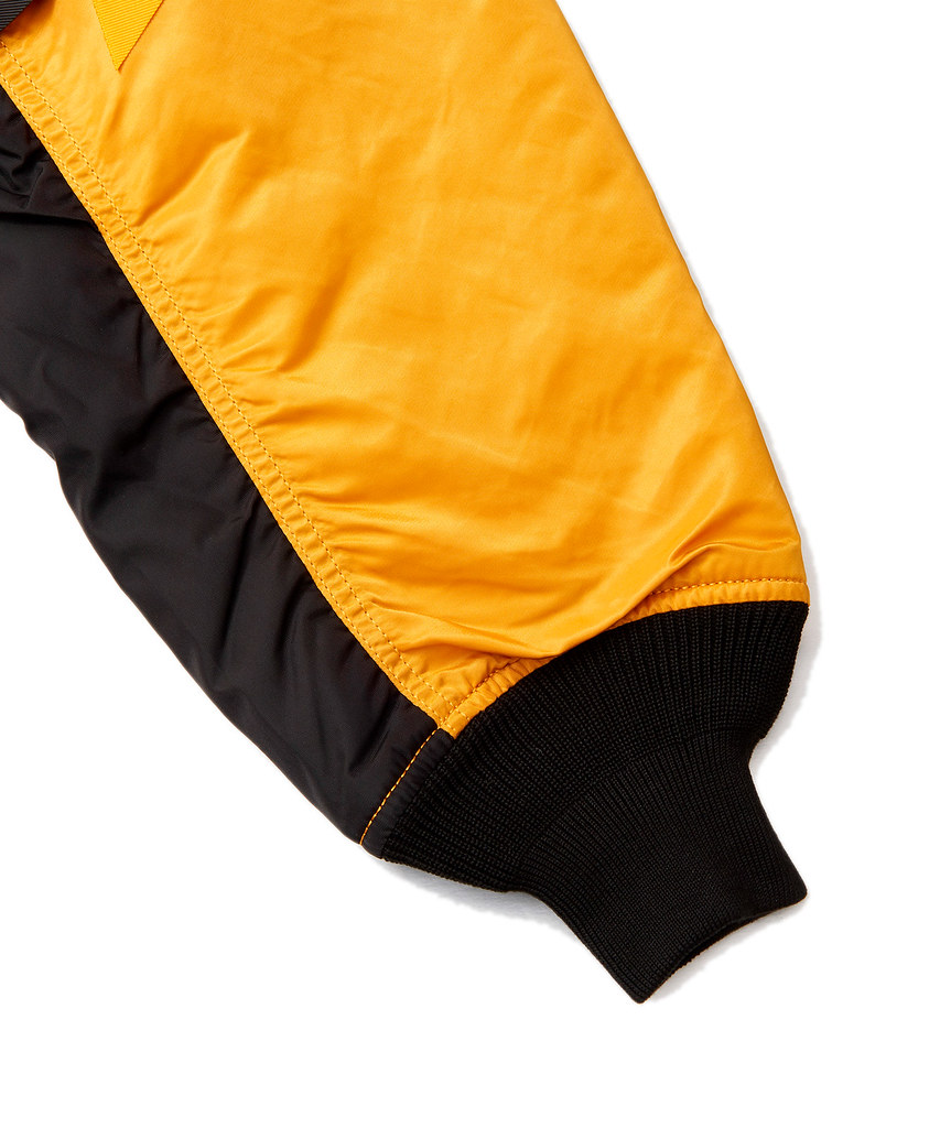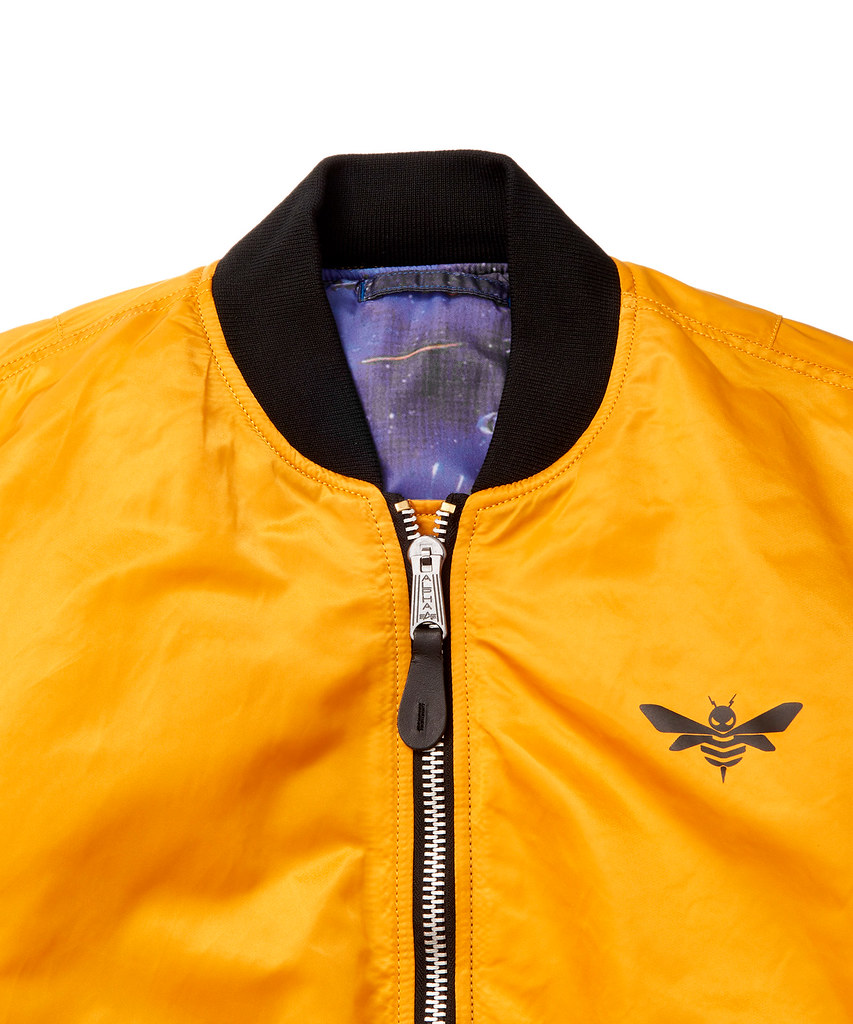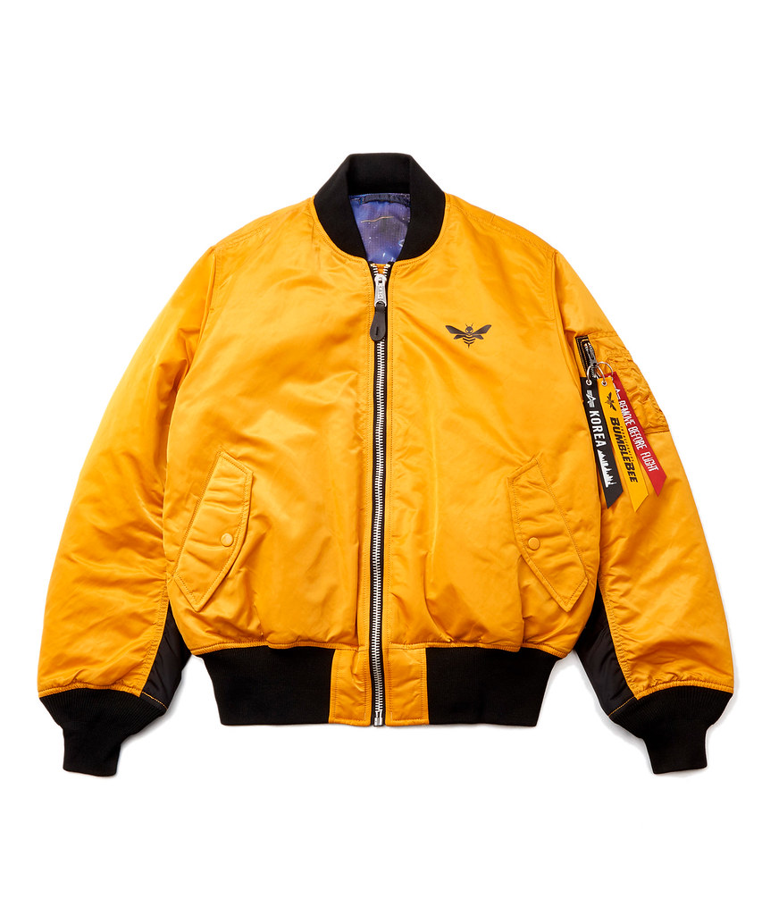 本次的MA-1 可以雙面穿,一面是以「大黃蜂」經典的黃色為主調,領口、袖子內側、袖口、下擺縮口則是選用黑色來搭配,在左胸口有著一隻看起來殺氣很強的蜜蜂:D 背後則是帥氣的博派LOGO 和TRANSFORMERS 字樣,還有貫穿背部的兩條黑條紋,令人想到大黃蜂的雪弗蘭載具模式呢!