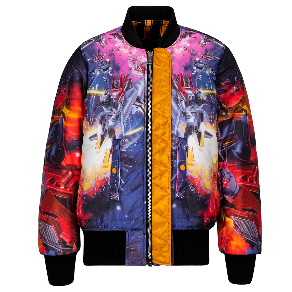 翻過來另一面則是會讓老粉絲大懷念的《Transformers: Generation 1 (G1)》主題,整體以鮮豔、豐富的顏色呈現出兩派變形金剛在星際之間大戰的圖樣,爆炸的火光、渲染的色彩給人相當強烈的視覺效果!除此之外,還有像是心口位置的博派、Alpha Industries 刺繡圖樣這類的設計巧思,好想穿著這件去看《大黃蜂》呀~