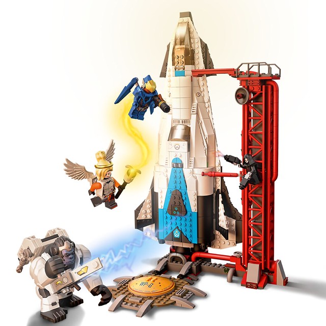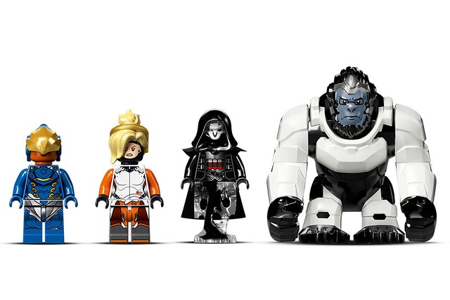 最後就是本次最大的盒組「直布羅陀」,人偶陣容包含大尺寸的猩猩科學家溫斯頓(Winston)、慈悲(Mercy)、法拉(Pharah)和死神!玩家一樣能夠藉由這組來重溫執行護送任務時的辛苦呀~:D 除了豐富的人偶外,火箭本體、發射台的還原度也非常高!溫斯頓還有花生醬可以吃喔~