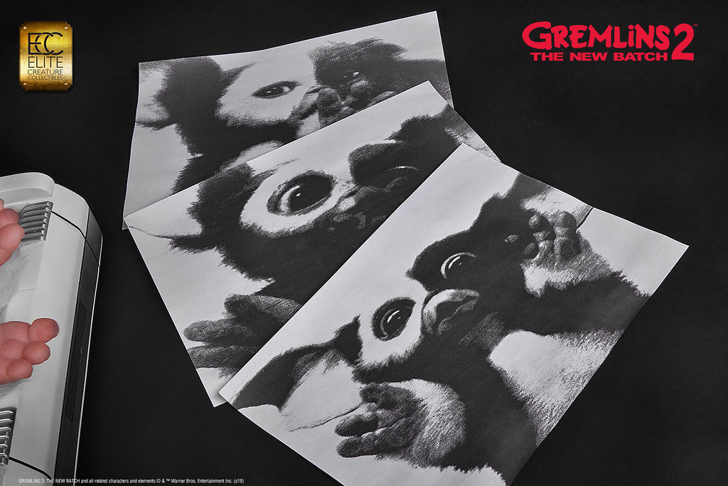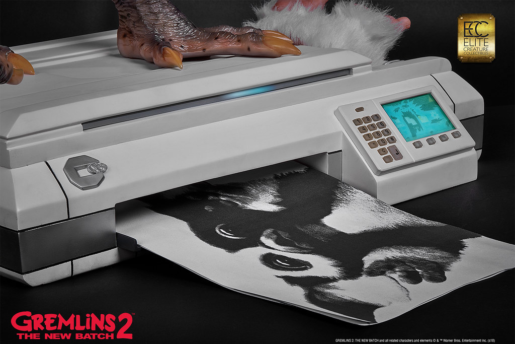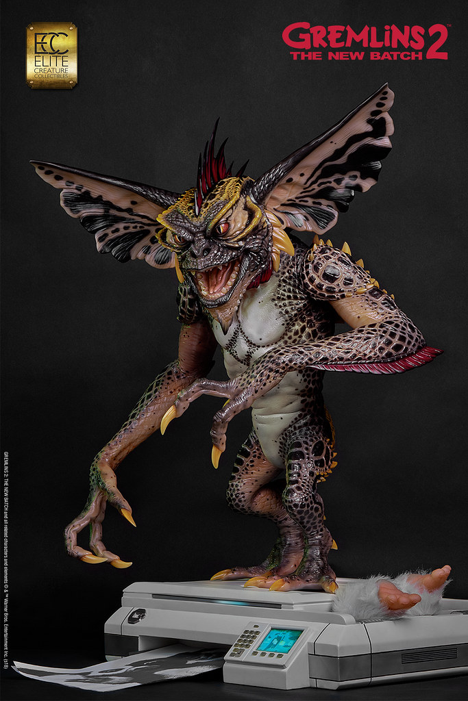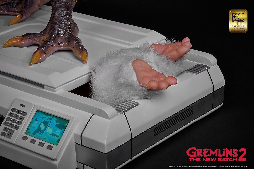 本作採用1:1 比例打造,高度來到78.7 公分,再現了Mohawk 在辦公室裡欺負Gizmo,還把他壓進影印機裡的場景!以Polystone、半透明樹脂等複合式材料製作,並以精緻的手工塗裝徹底還原Mohawk 的造型設定,粗糙的皮膚、色彩鮮豔的紋路、爪子與尖刺表面的角質層......等身體細節絕對讓粉絲大呼過癮,黏糊糊的表皮、炯炯有神的眼珠則讓作品更添逼真的生物感;而影印機除了有電流化的小精靈外顯示在畫面中,還搭載LED 光效和音效,Gizmo 則是露出兩隻肥肥短短、毛茸茸的腳,好可憐但是好可愛呀!