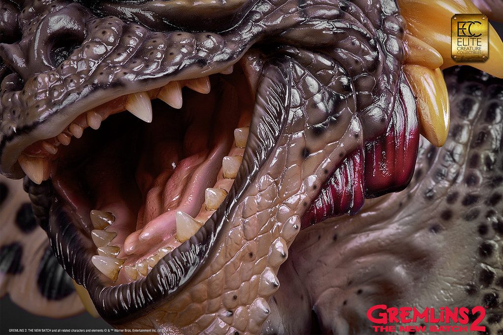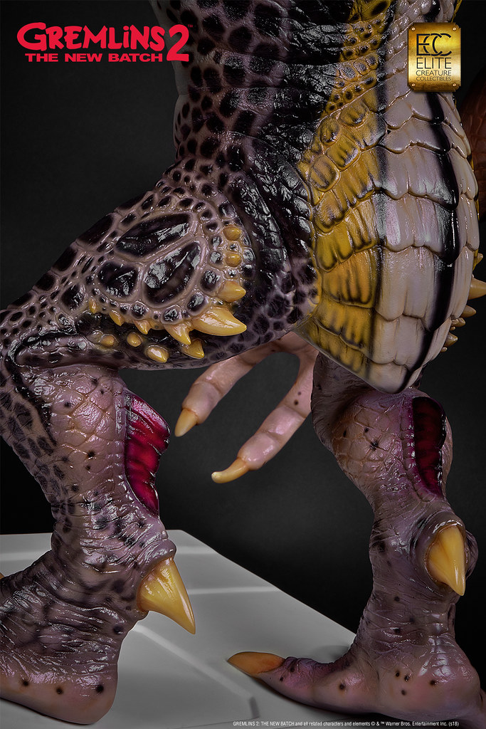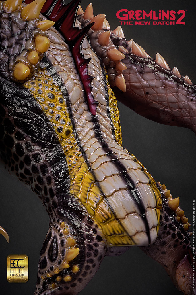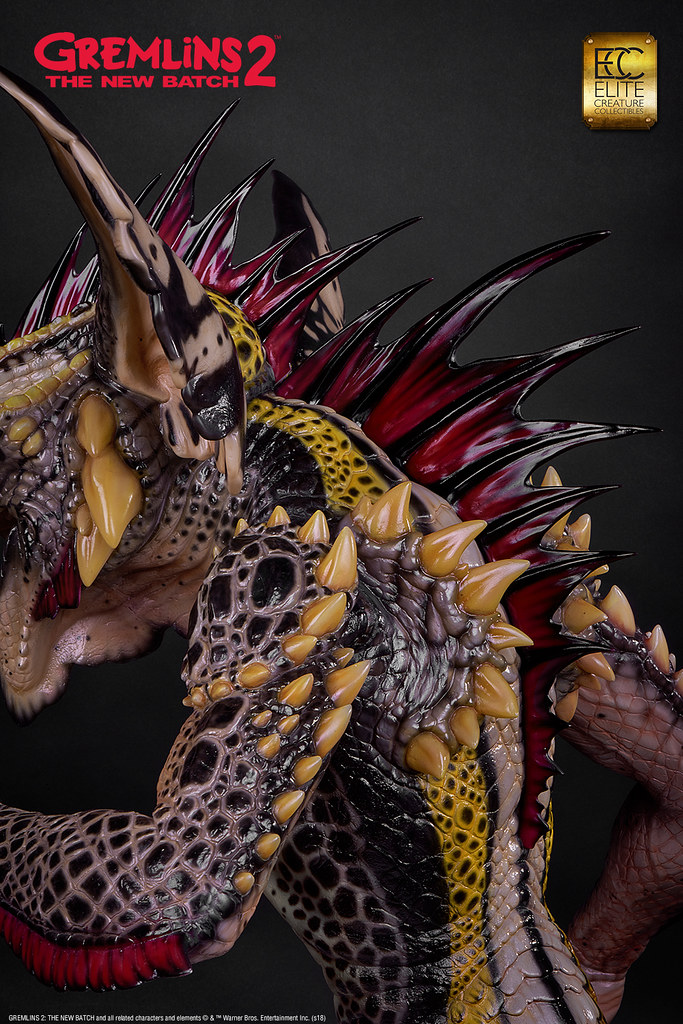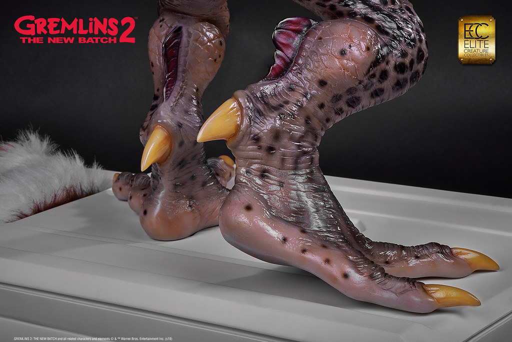 本作採用1:1 比例打造,高度來到78.7 公分,再現了Mohawk 在辦公室裡欺負Gizmo,還把他壓進影印機裡的場景!以Polystone、半透明樹脂等複合式材料製作,並以精緻的手工塗裝徹底還原Mohawk 的造型設定,粗糙的皮膚、色彩鮮豔的紋路、爪子與尖刺表面的角質層......等身體細節絕對讓粉絲大呼過癮,黏糊糊的表皮、炯炯有神的眼珠則讓作品更添逼真的生物感;而影印機除了有電流化的小精靈外顯示在畫面中,還搭載LED 光效和音效,Gizmo 則是露出兩隻肥肥短短、毛茸茸的腳,好可憐但是好可愛呀!