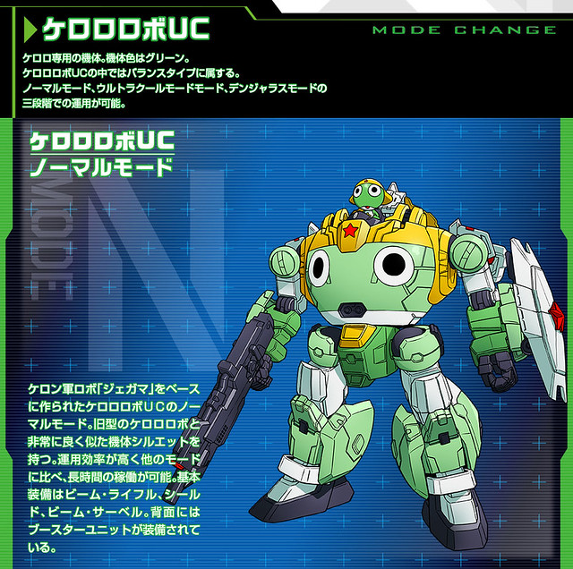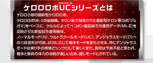 「KERORO魂 KERORO機器人UC」是運用了『ROBOT魂』系列的可動技術的完成品可動模型,外觀擁有精密的刻線細節,內藏「普通模式(N)」>「ULTRA COOL 模式(UC)」>「危險模式(D)」三段變形機構,普通模式的造型酷似初代 KERORO 機器人,而多了那根角的 UC 模式讓人腦中響起澤野弘之的BGM,到了「危險模式」還真的是很危險(法律面),變形的模樣怎麼看都是獨O獸的毀滅模式呢ww!